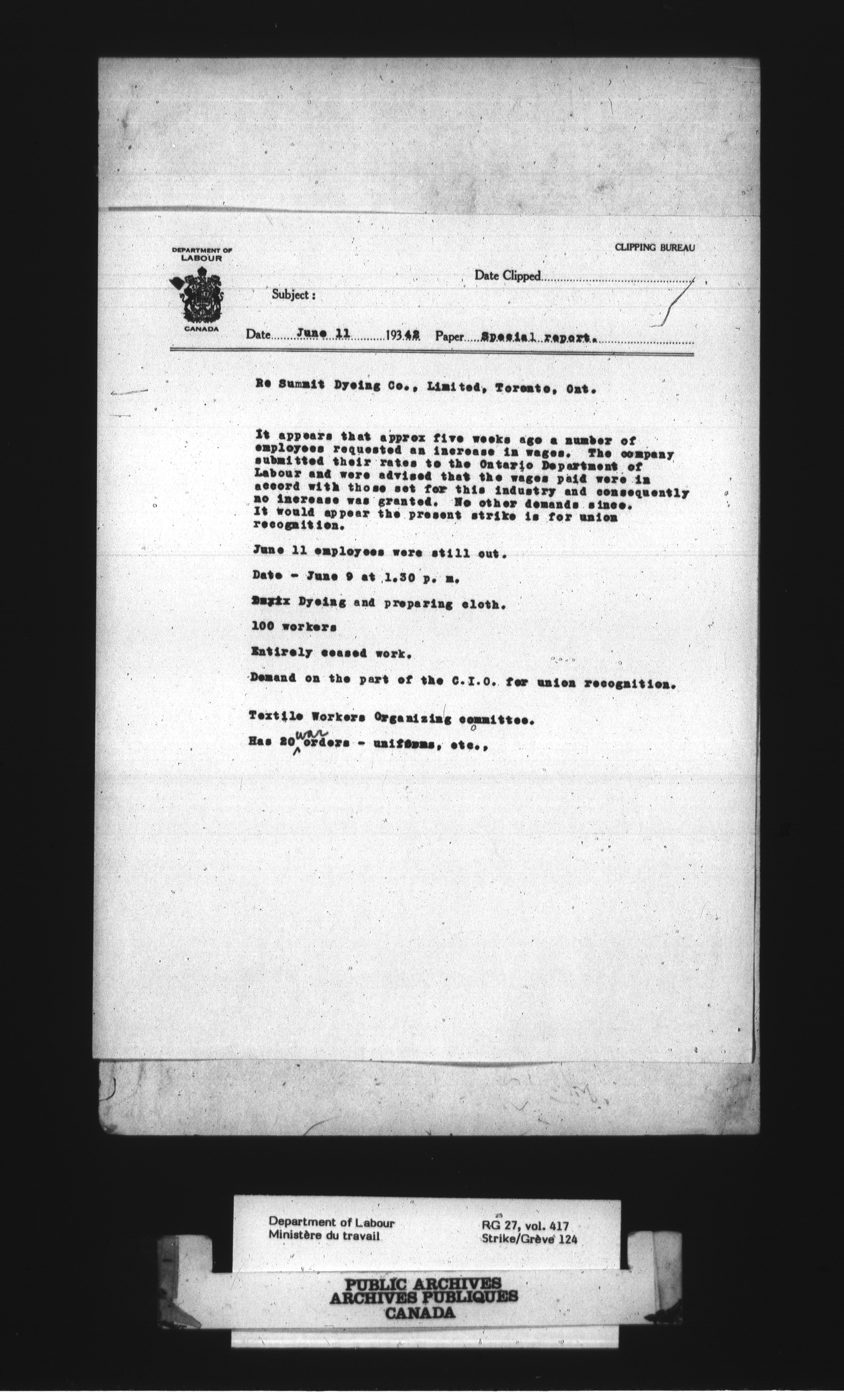 Department of Labour, Economics and Research Branch : Strikes and lockout files : T-3022