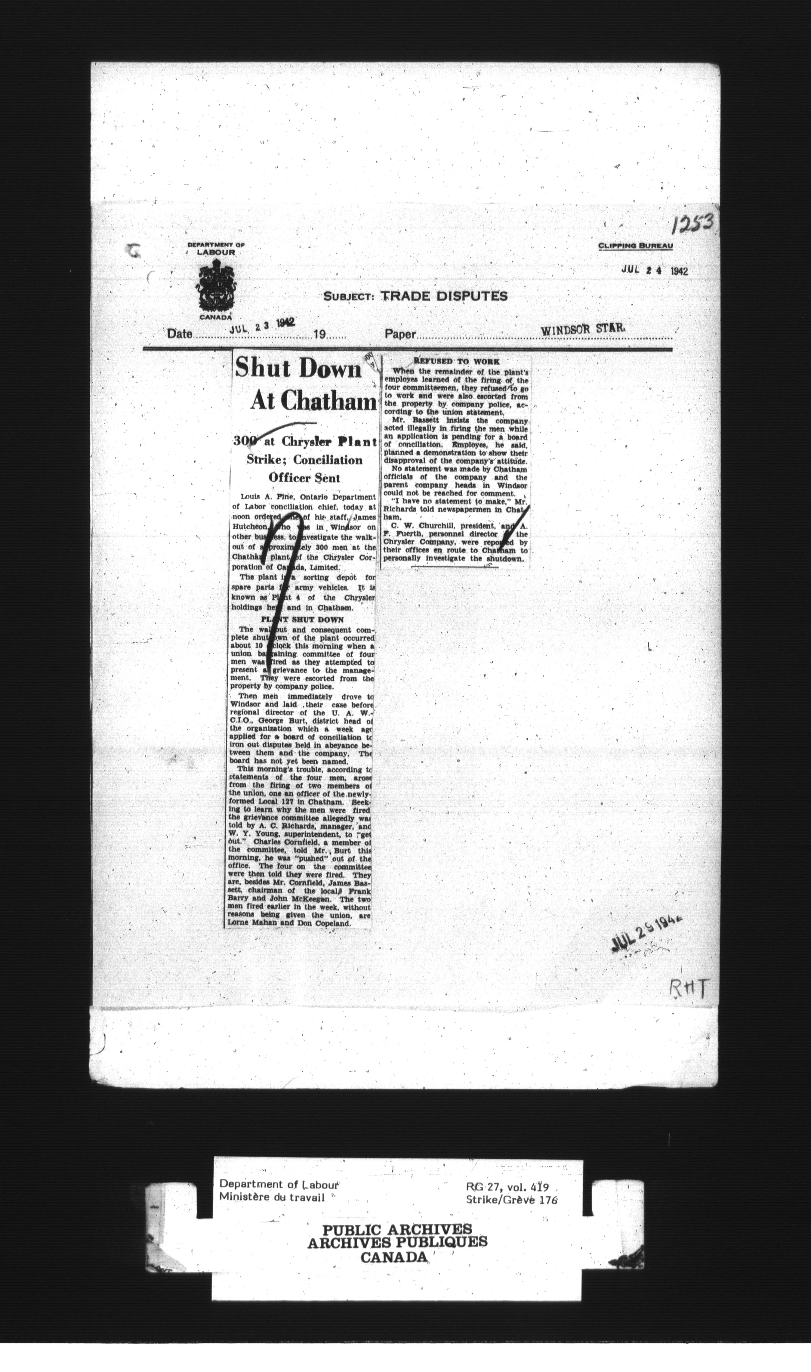 Department of Labour, Economics and Research Branch : Strikes and lockout files : T-3024