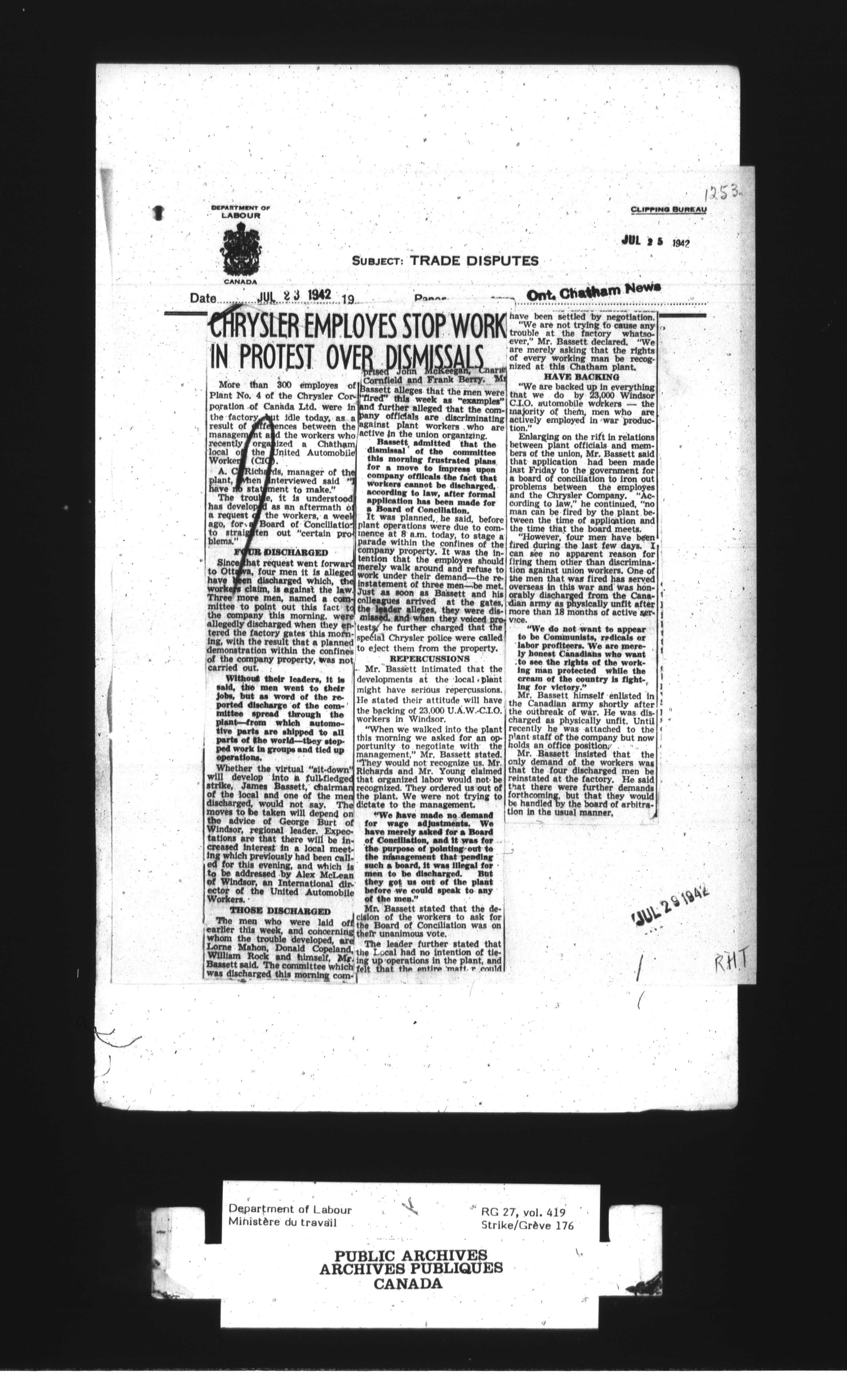 Department of Labour, Economics and Research Branch : Strikes and lockout files - 3024