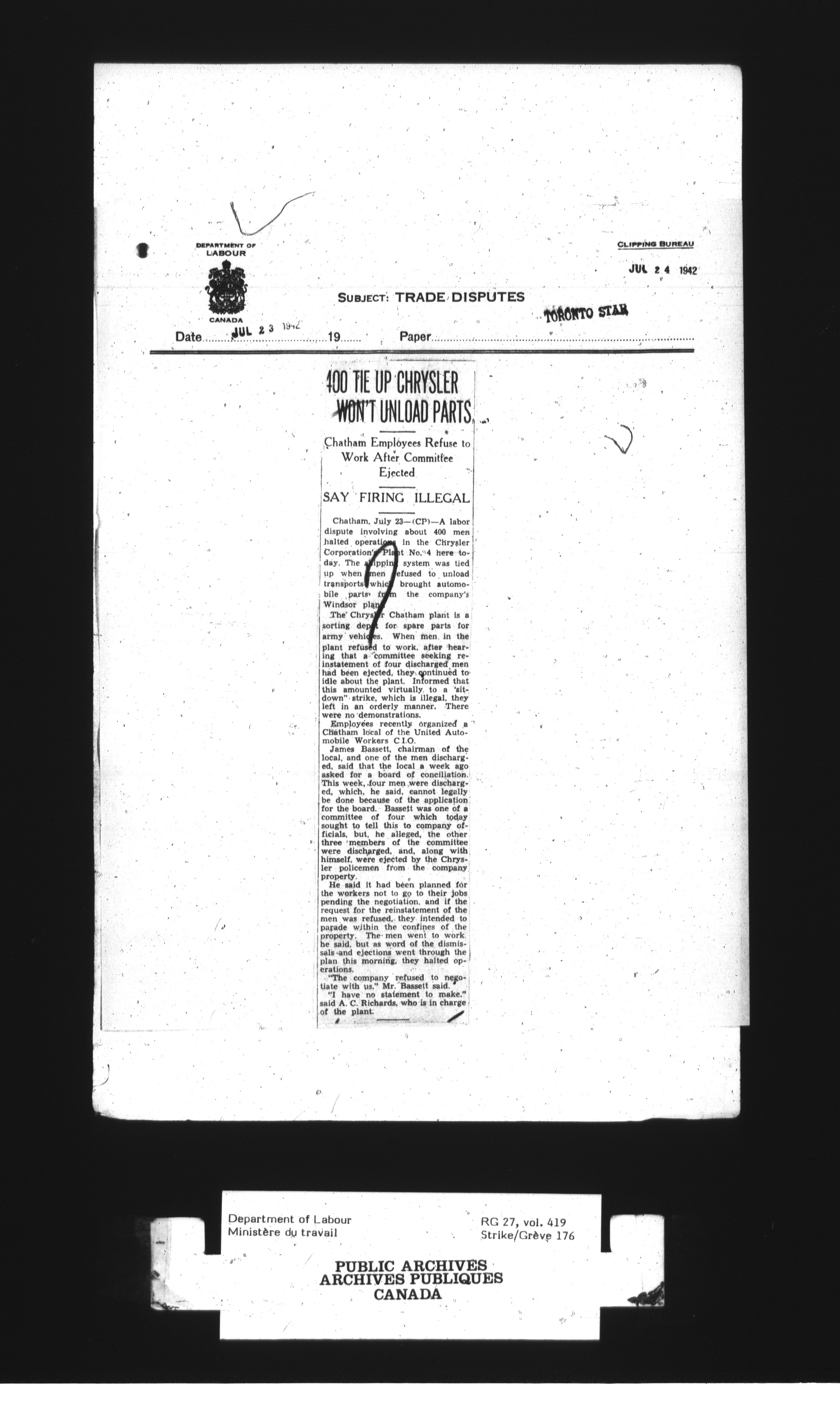 Department of Labour, Economics and Research Branch : Strikes and lockout files - 3024