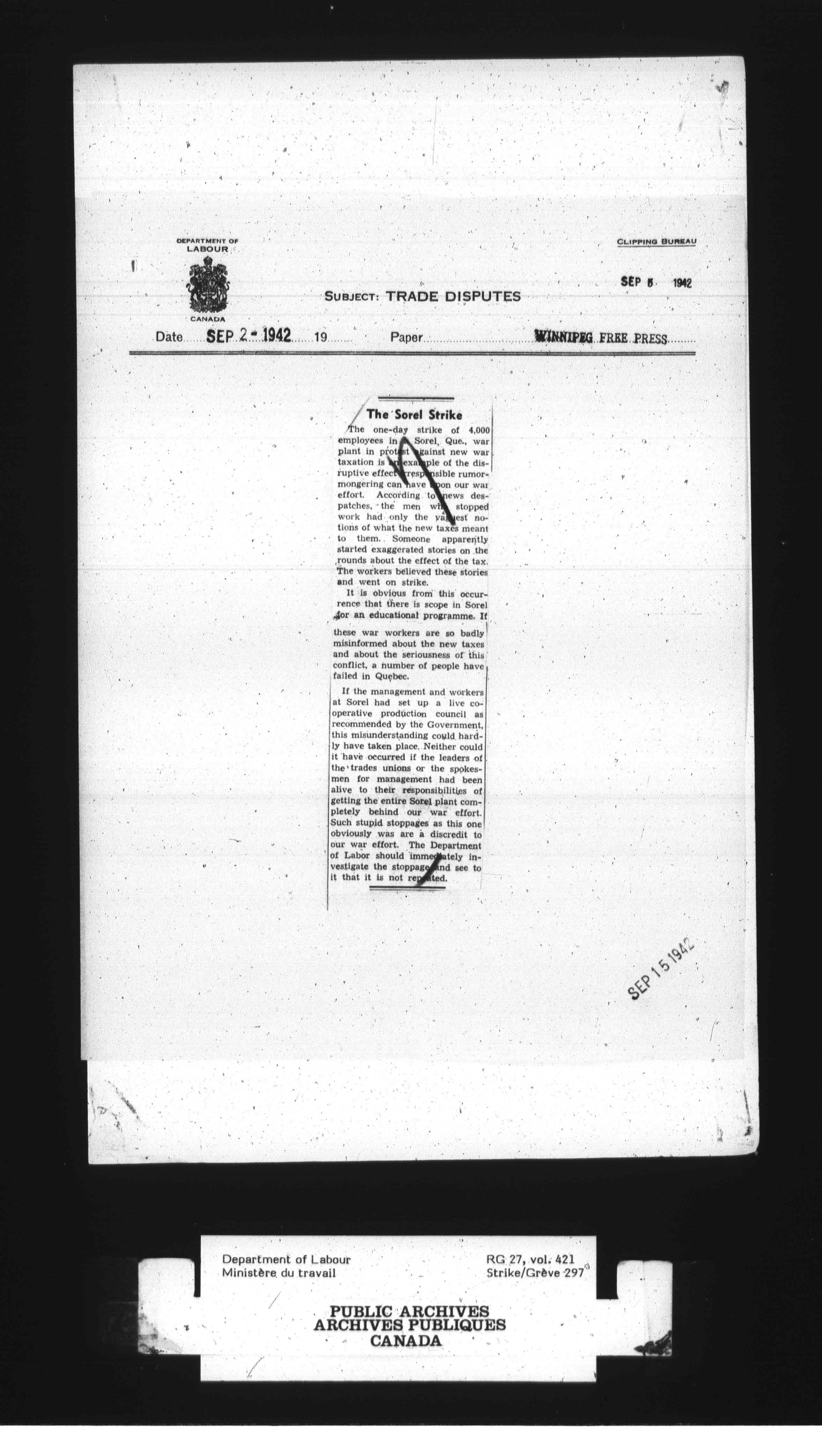 Department of Labour, Economics and Research Branch : Strikes and lockout files : T-3026