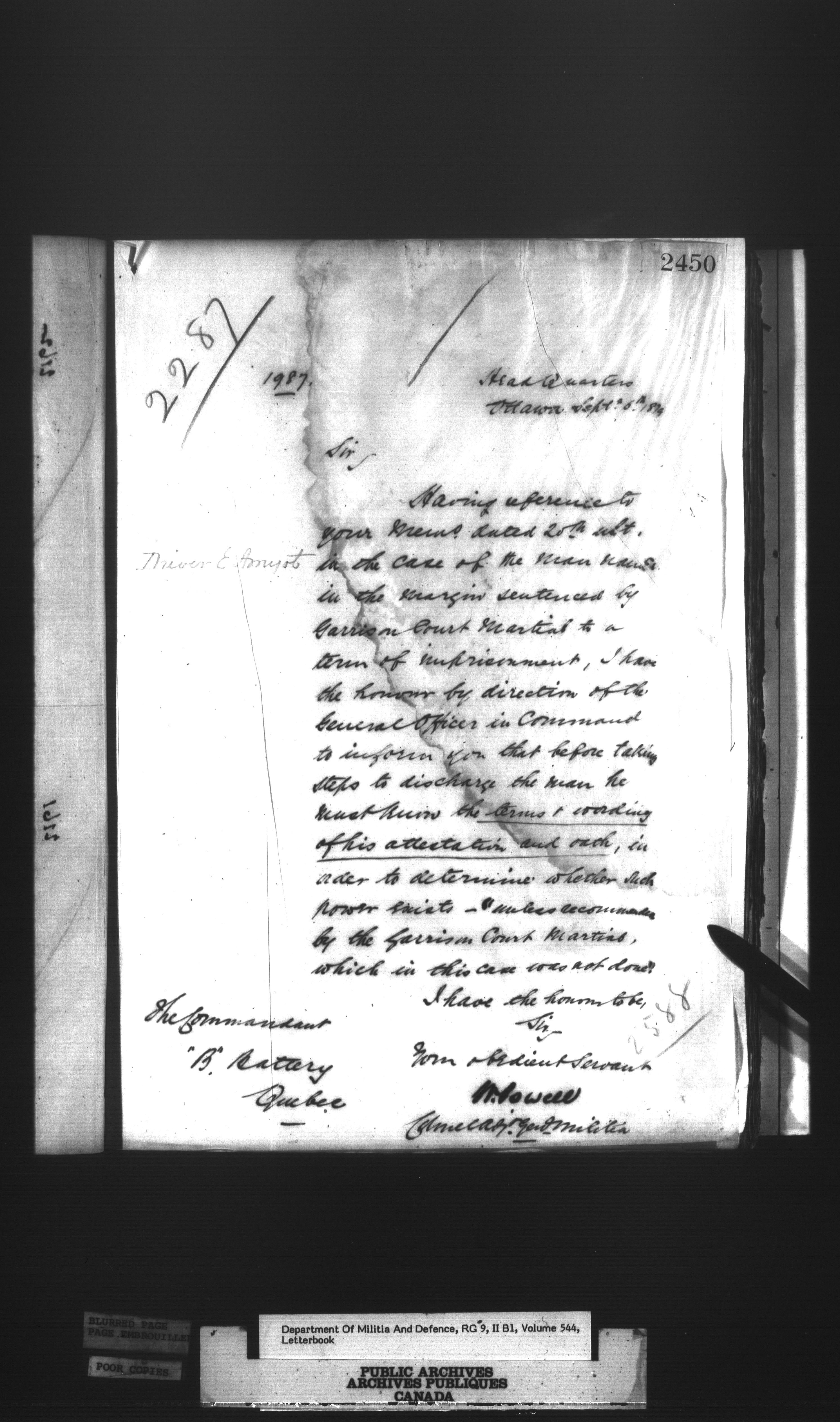 Correspondence of the General Officer Commanding (GOC) of the Canadian Militia and his predecessor, the Adjutant General - 303
