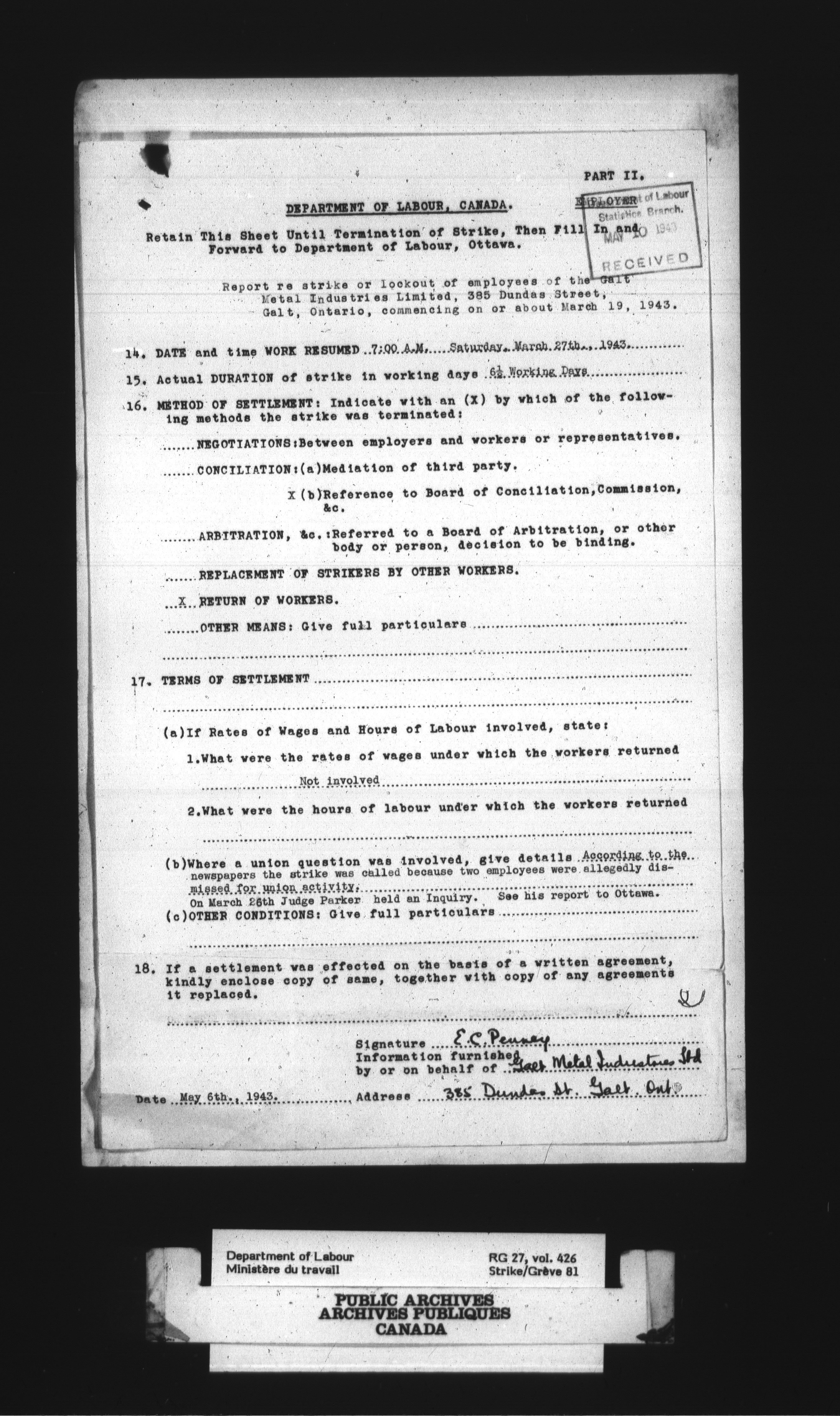 Department of Labour, Economics and Research Branch : Strikes and lockout files : T-3030