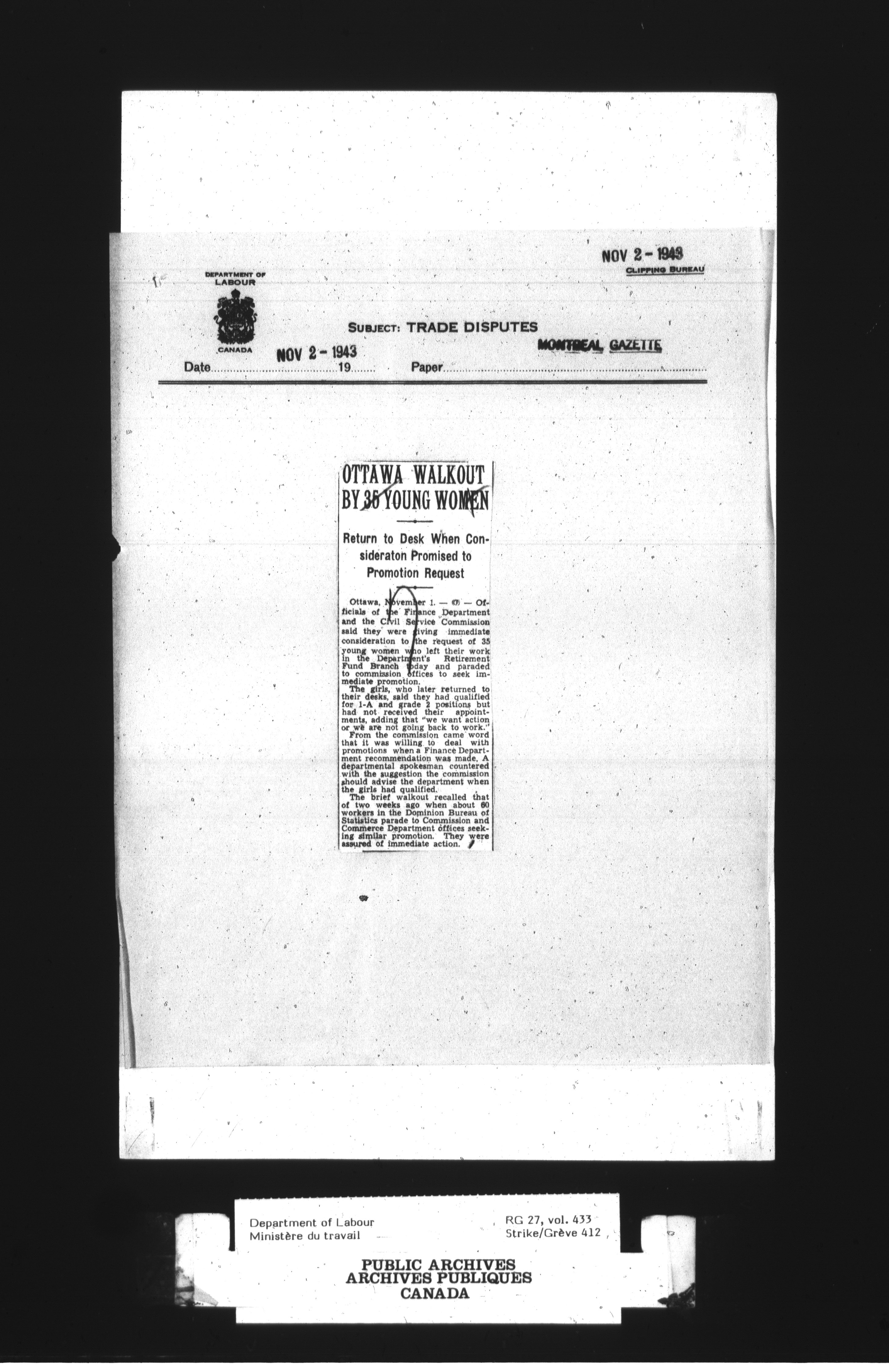 Department of Labour, Economics and Research Branch : Strikes and lockout files : T-3037