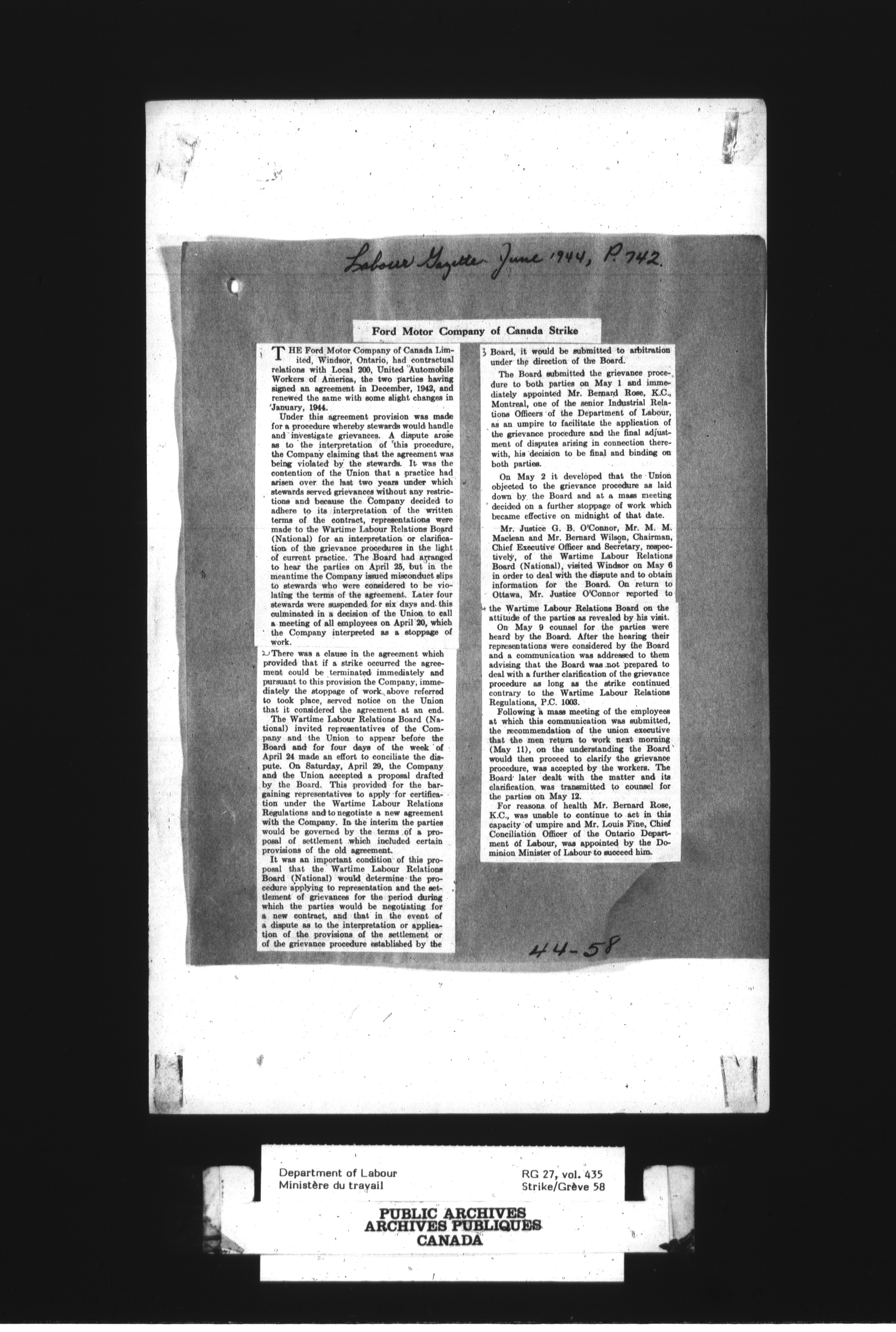 Department of Labour, Economics and Research Branch : Strikes and lockout files - 3038