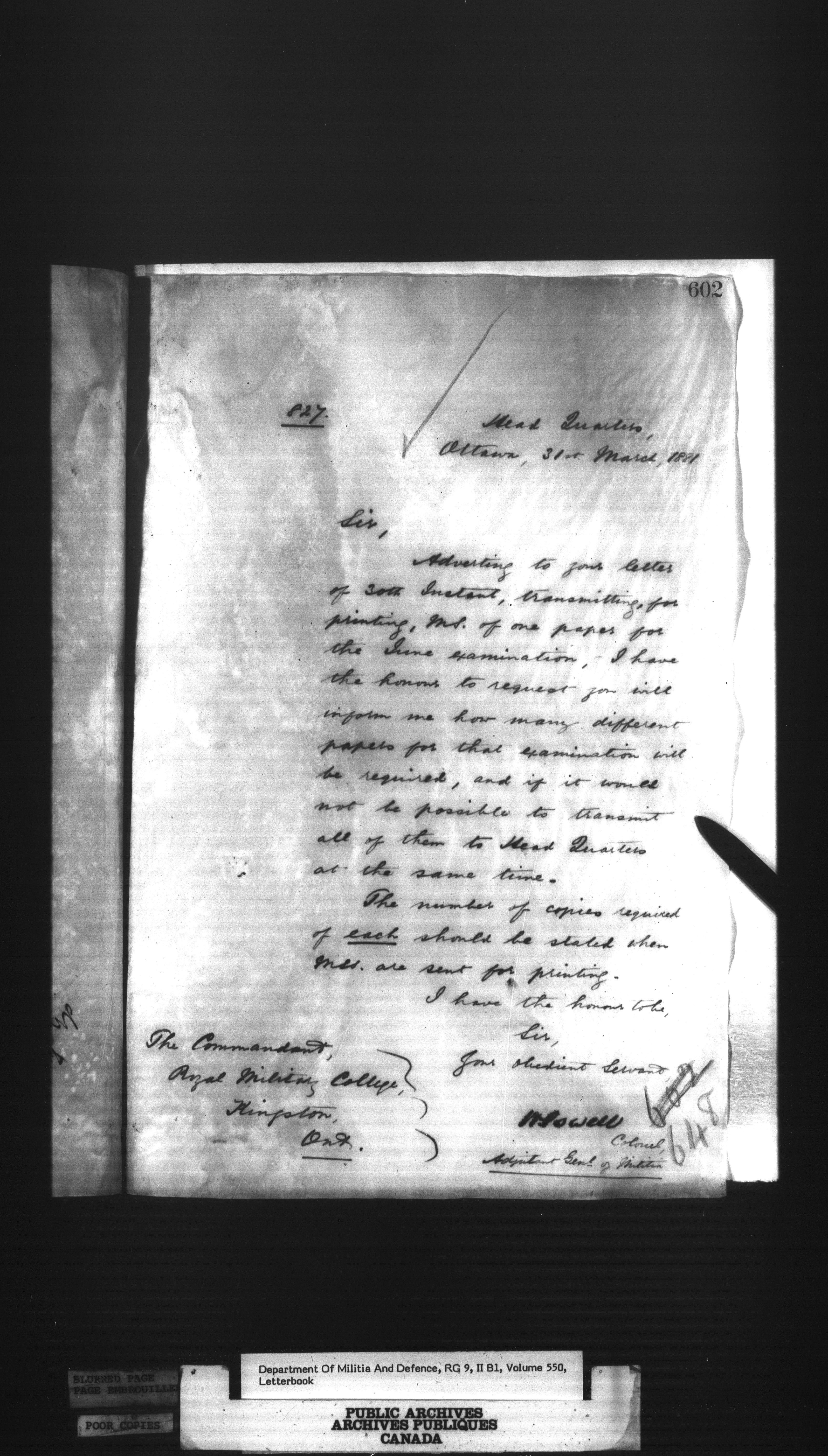 Correspondence of the General Officer Commanding (GOC) of the Canadian Militia and his predecessor, the Adjutant General - 308