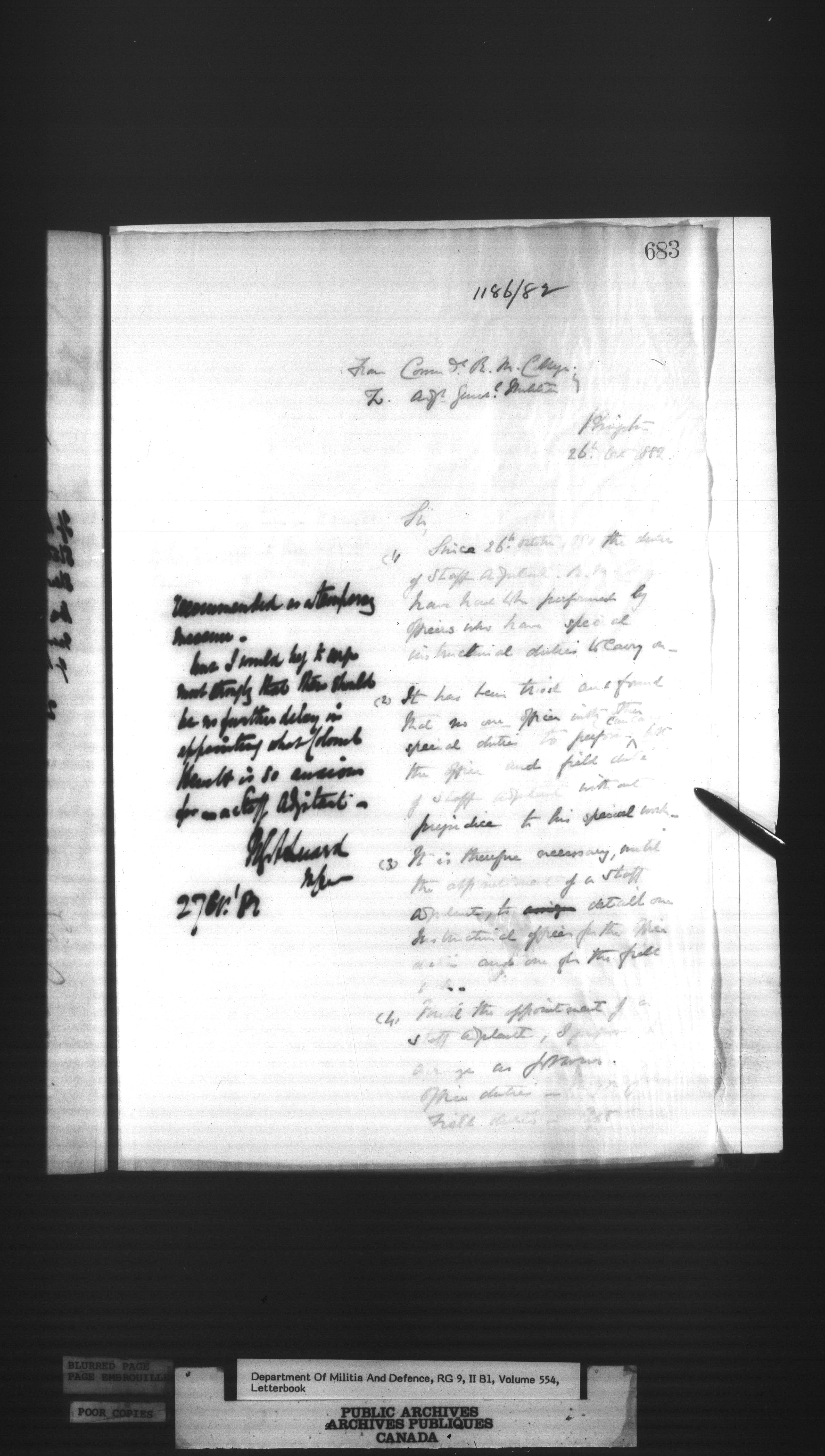 Correspondence of the General Officer Commanding (GOC) of the Canadian Militia and his predecessor, the Adjutant General - 310
