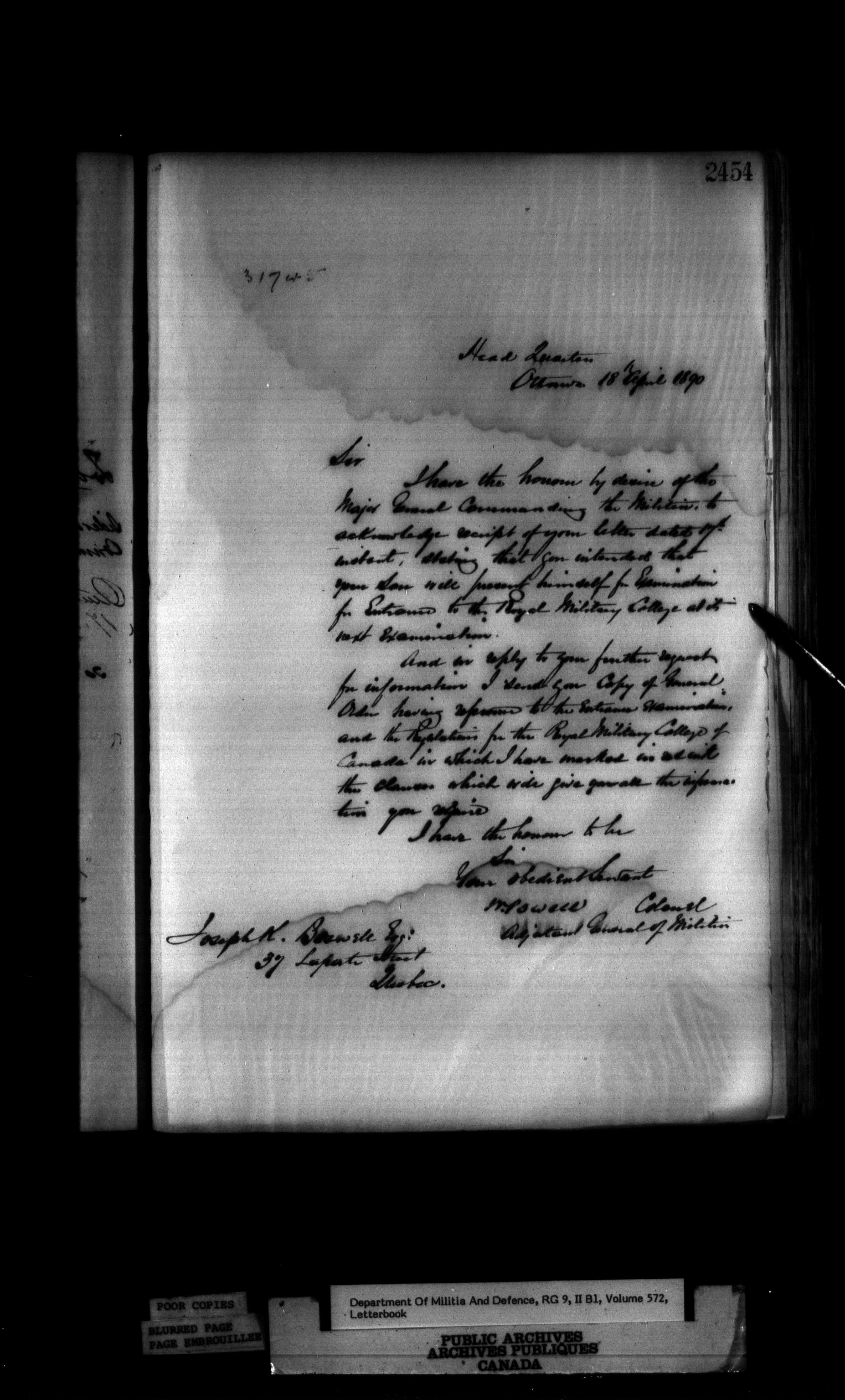 Correspondence of the General Officer Commanding (GOC) of the Canadian Militia and his predecessor, the Adjutant General - 323