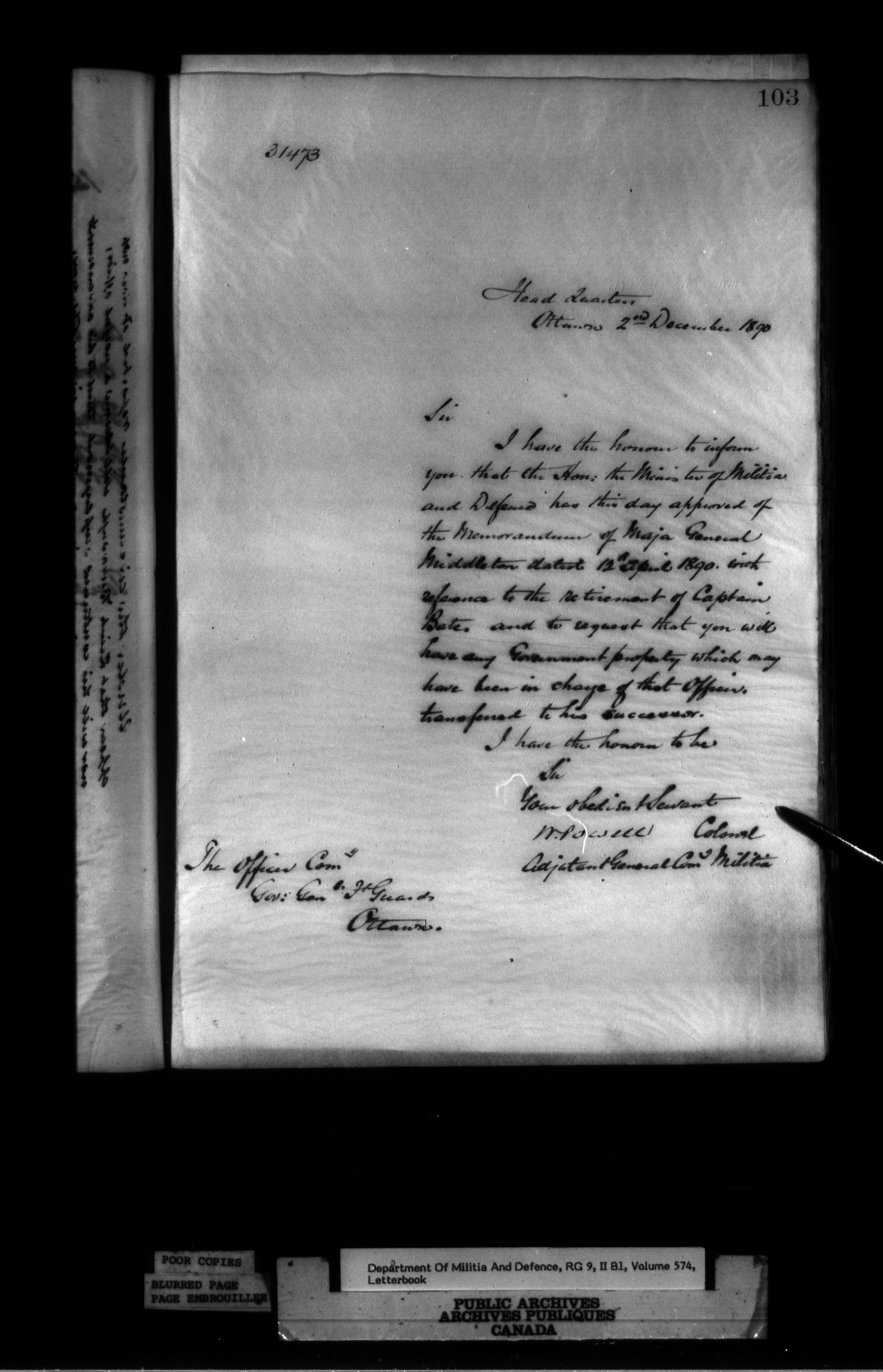 Correspondence of the General Officer Commanding (GOC) of the Canadian Militia and his predecessor, the Adjutant General - 324