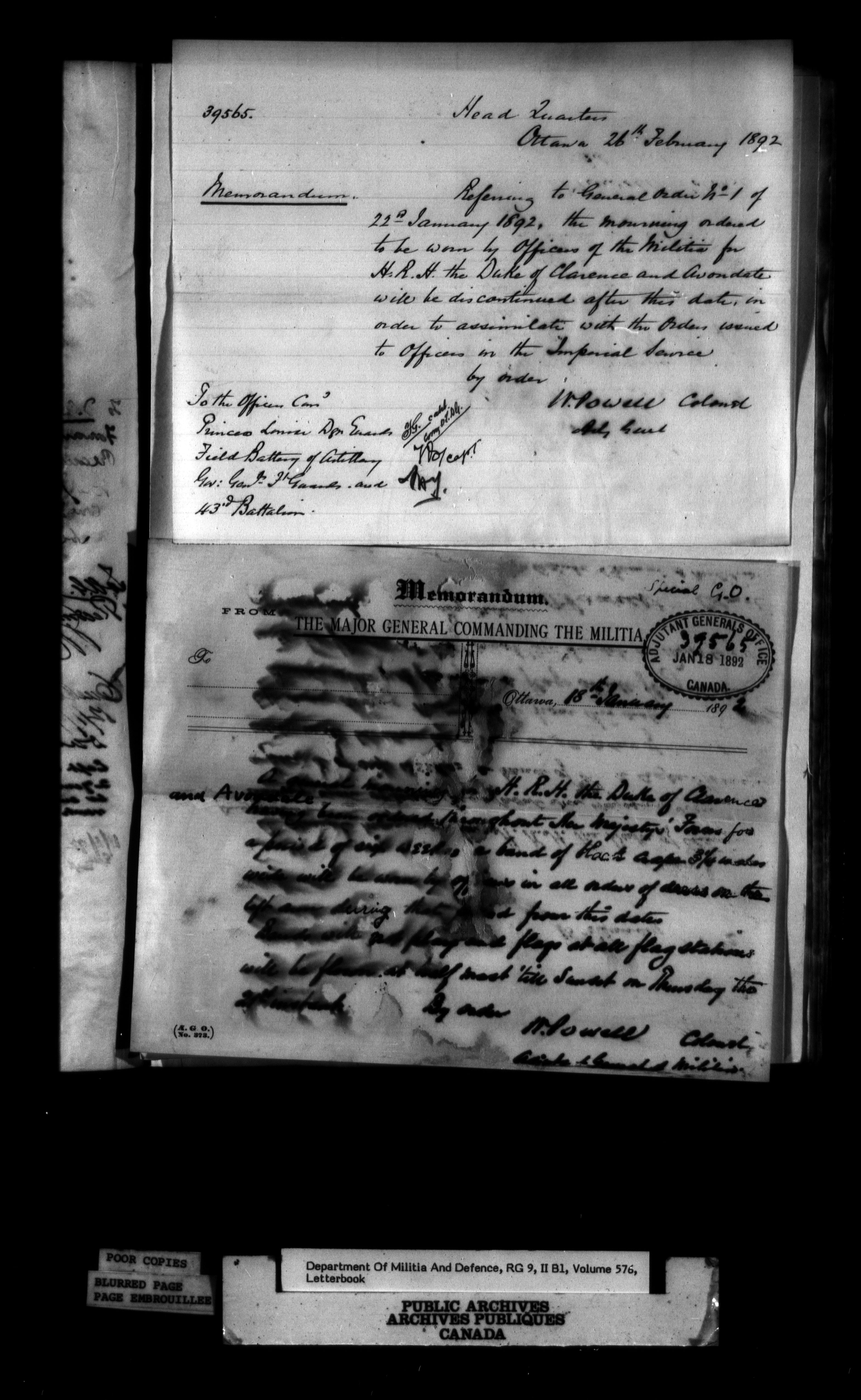 Correspondence of the General Officer Commanding (GOC) of the Canadian Militia and his predecessor, the Adjutant General - 327