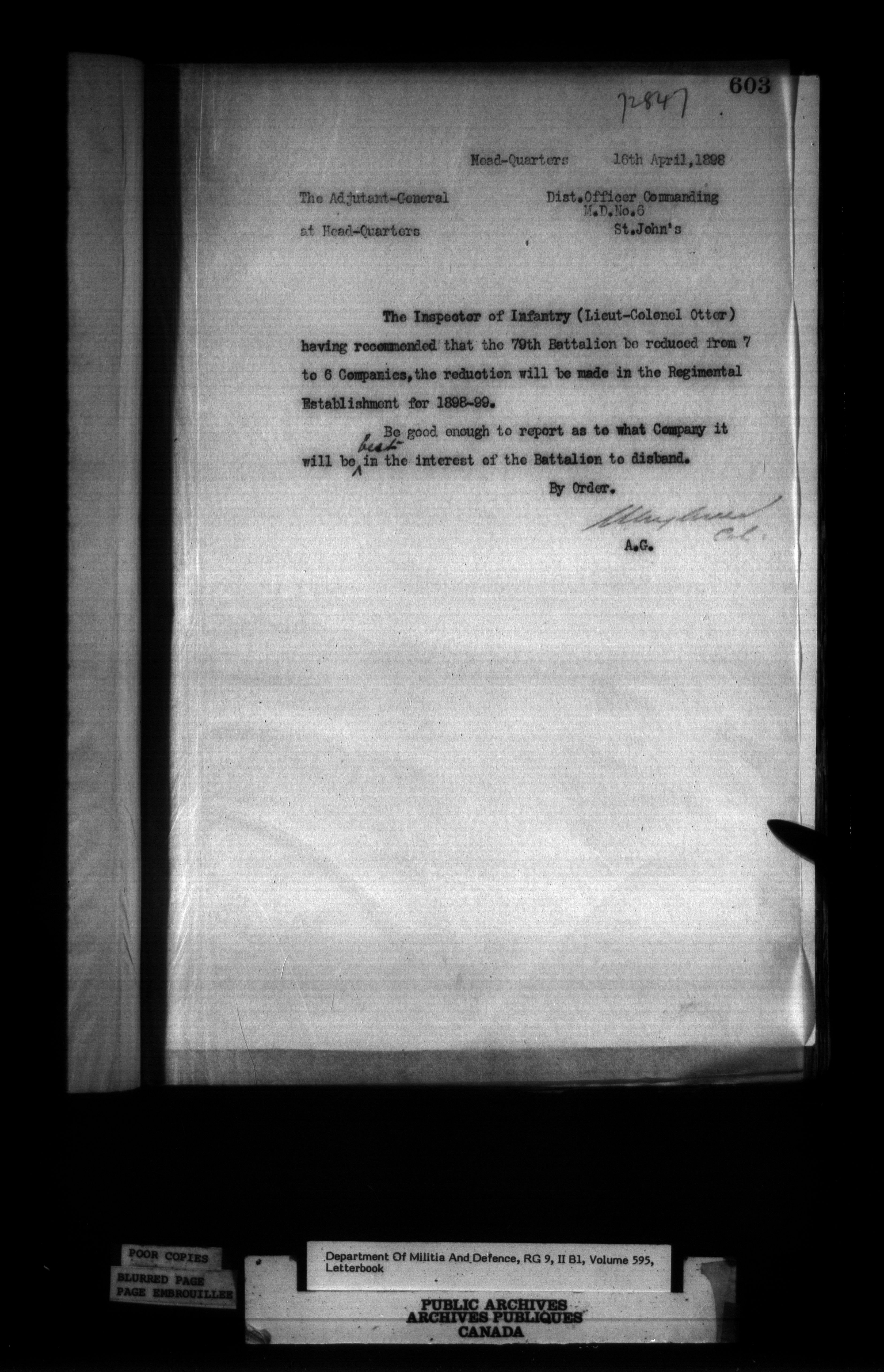 Correspondence of the General Officer Commanding (GOC) of the Canadian Militia and his predecessor, the Adjutant General - 339