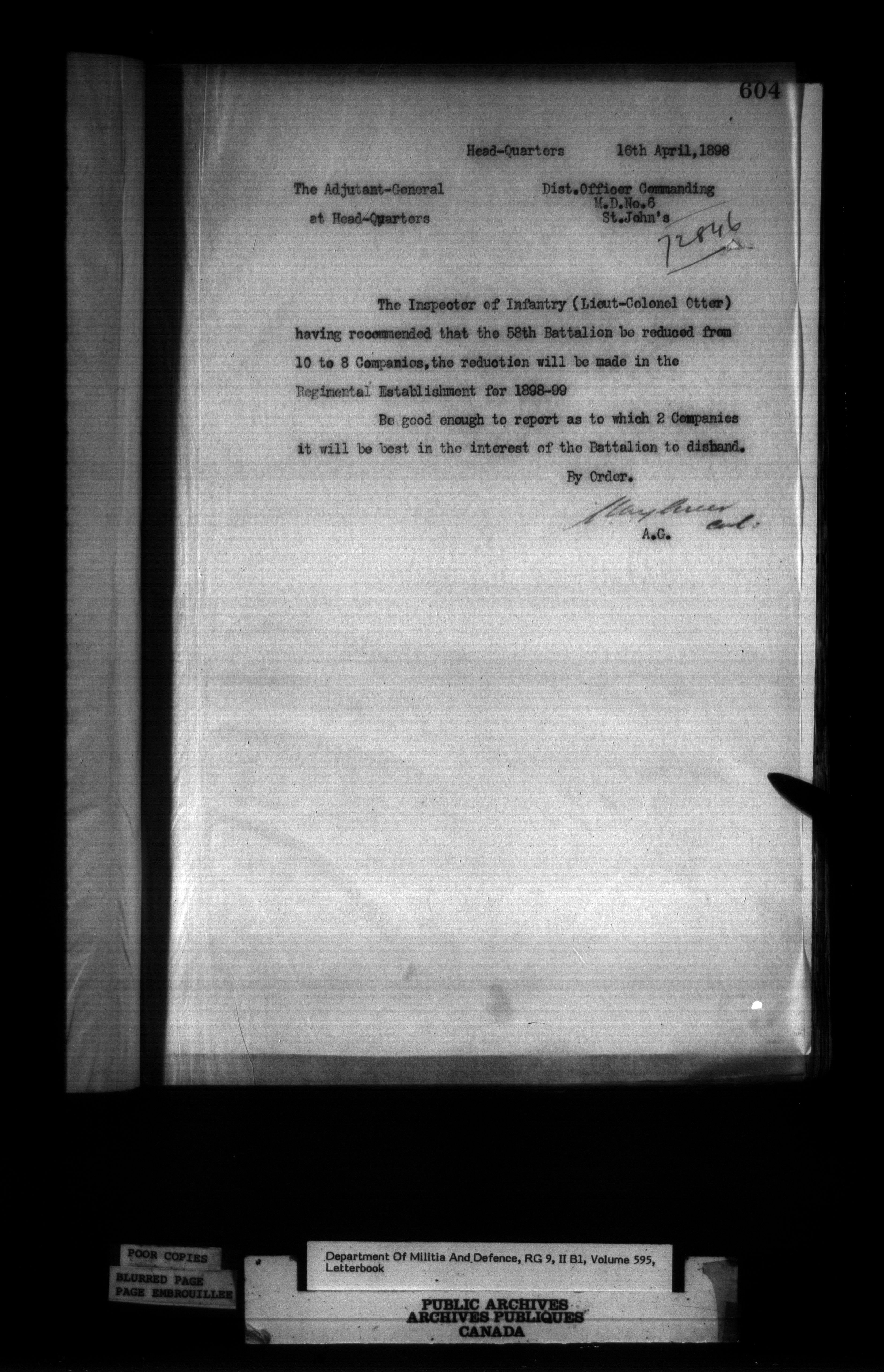 Correspondence of the General Officer Commanding (GOC) of the Canadian Militia and his predecessor, the Adjutant General - 339