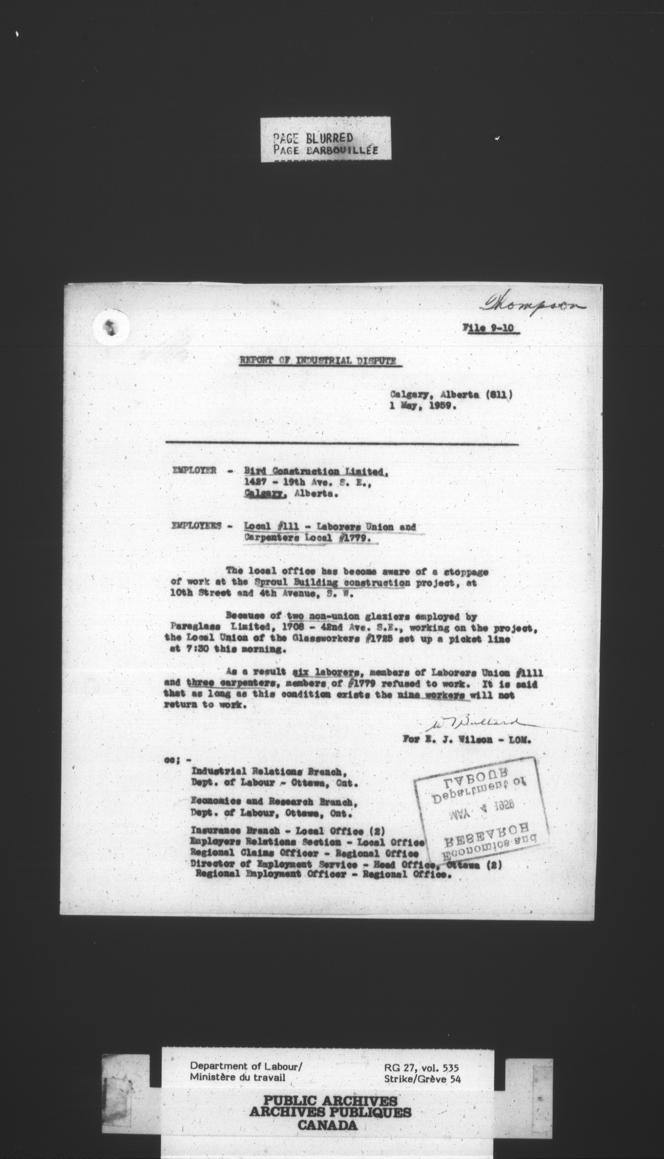 Department of Labour, Economics and Research Branch : Strikes and lockout files : T-3399