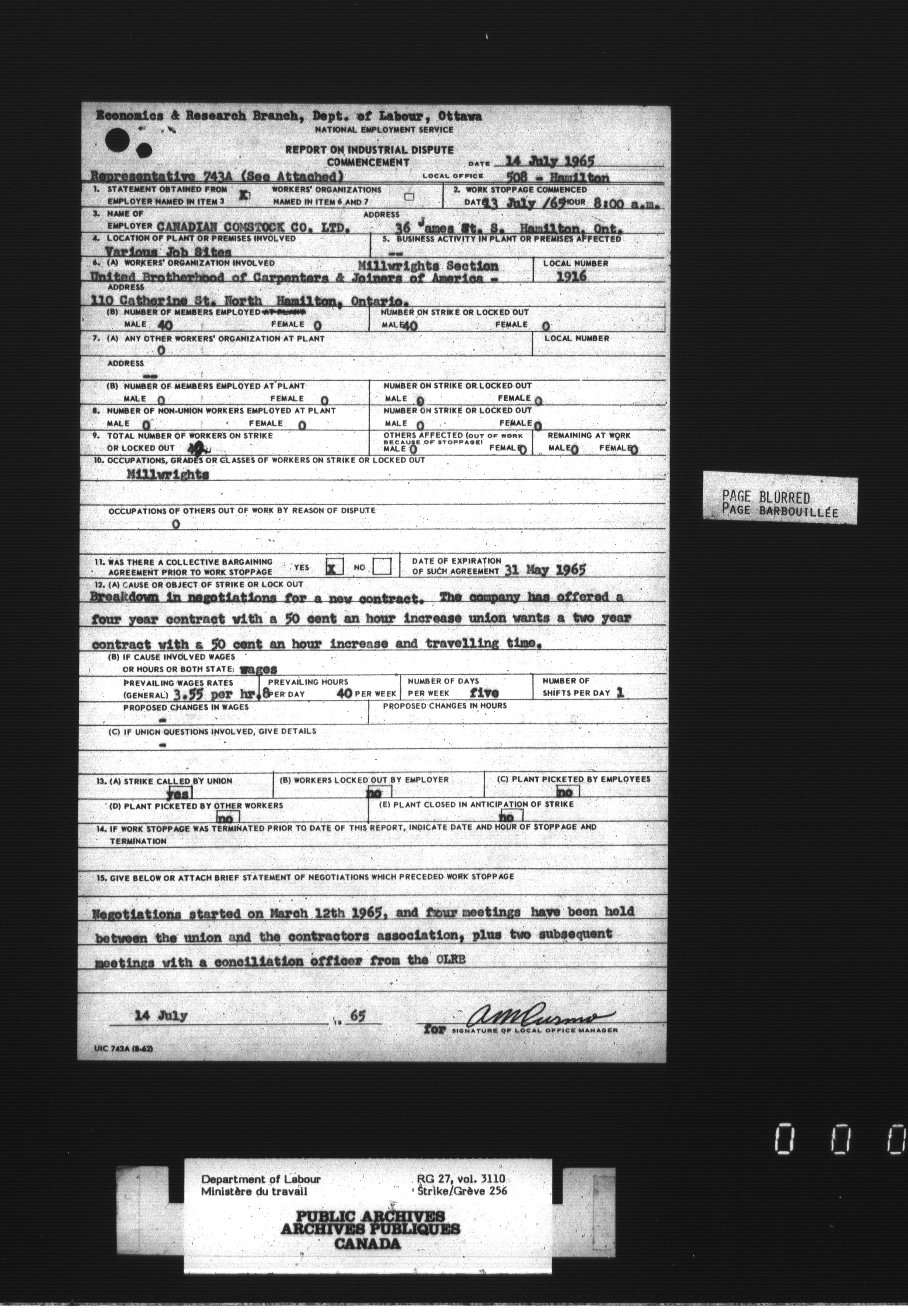 Department of Labour, Economics and Research Branch : Strikes and lockout files - 3416
