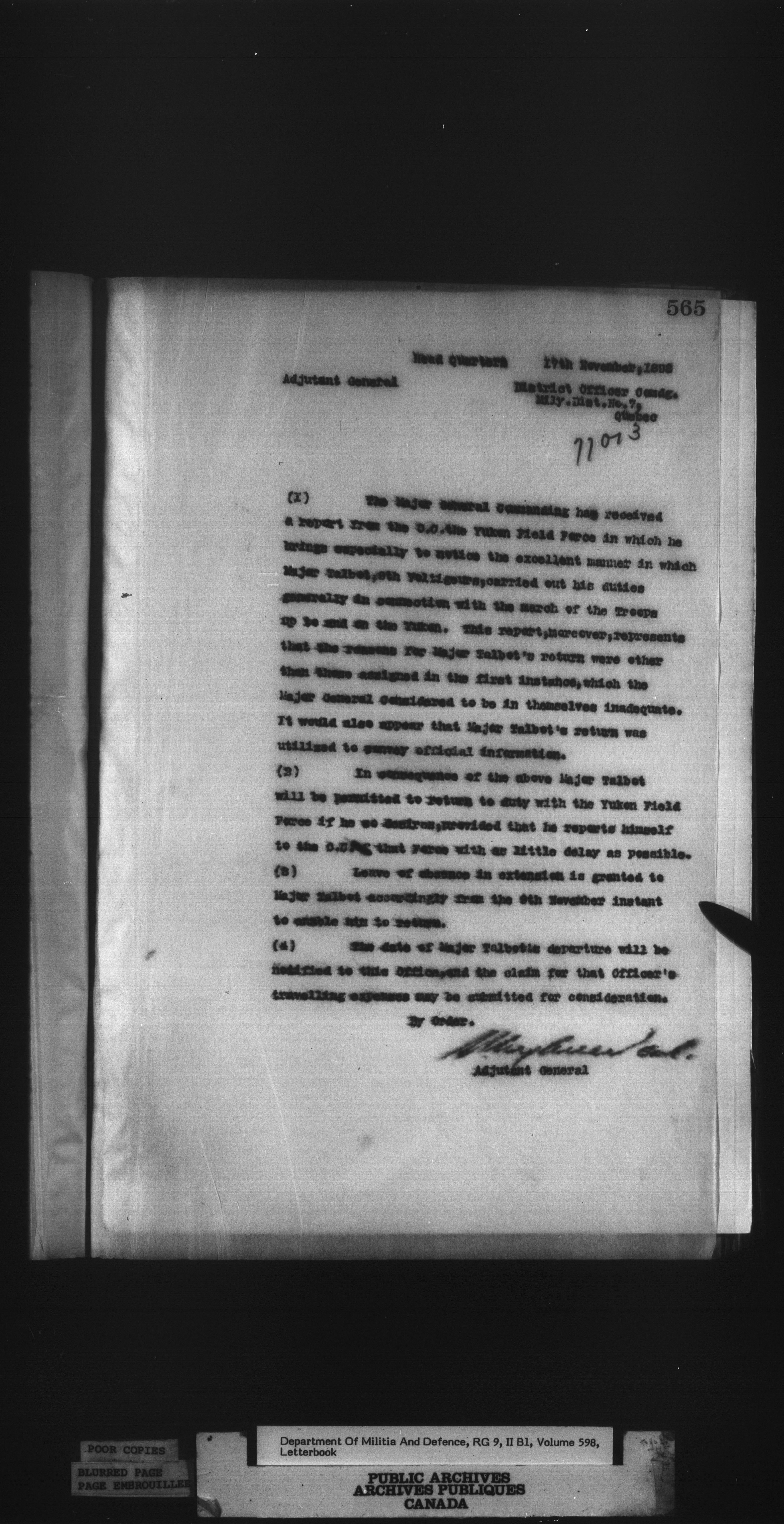 Correspondence of the General Officer Commanding (GOC) of the Canadian Militia and his predecessor, the Adjutant General : T-342