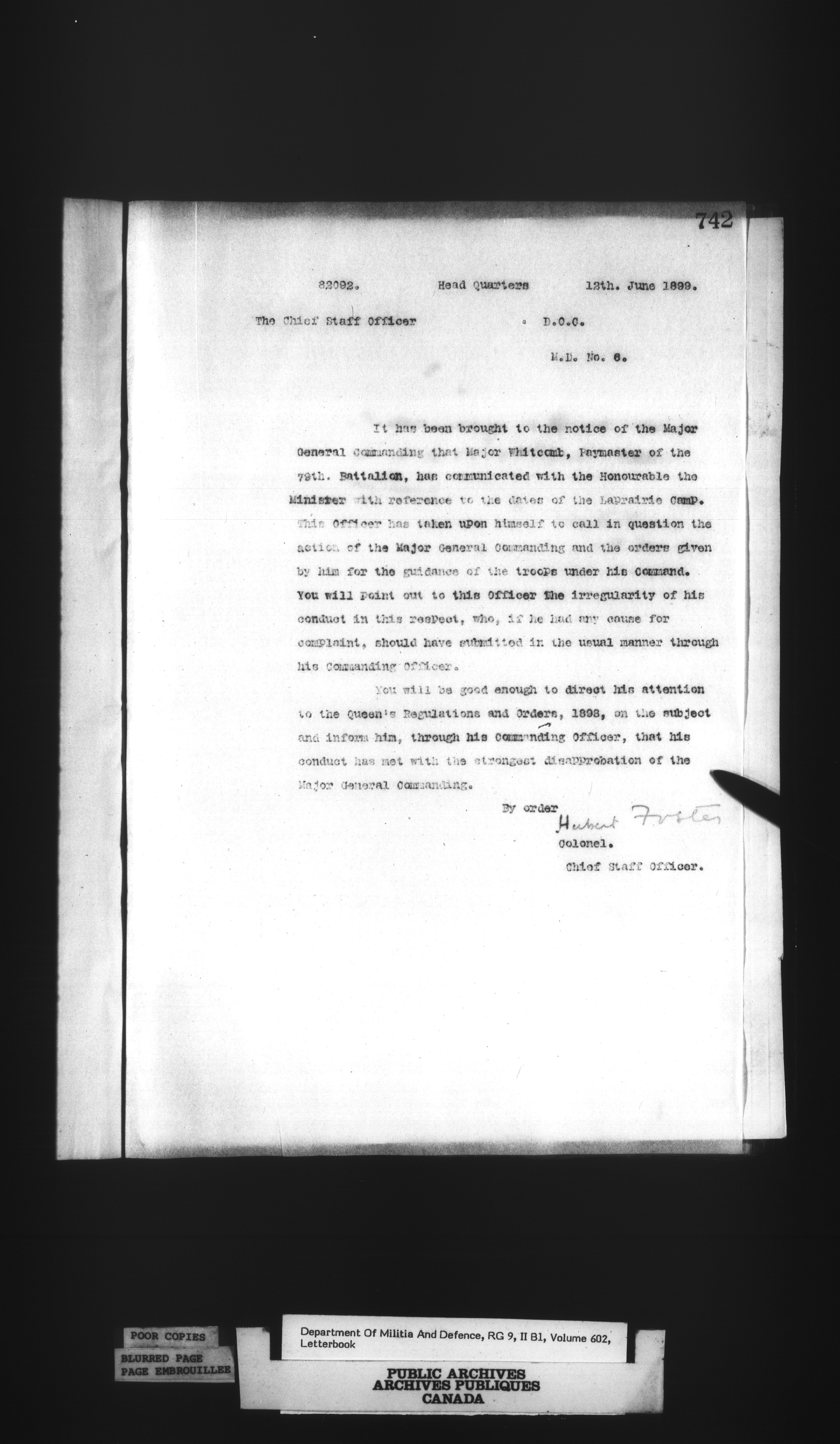 Correspondence of the General Officer Commanding (GOC) of the Canadian Militia and his predecessor, the Adjutant General - 344