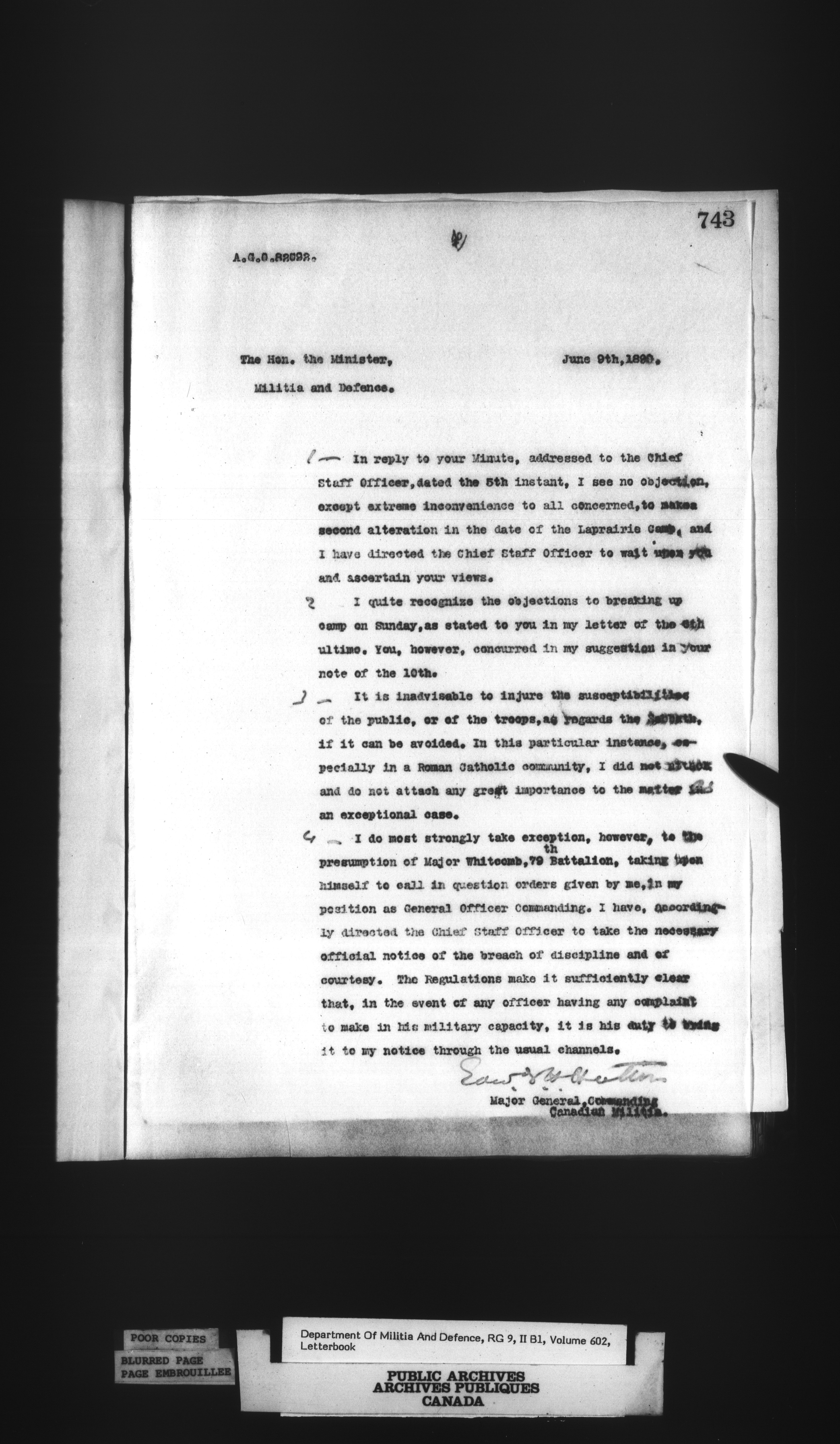 Correspondence of the General Officer Commanding (GOC) of the Canadian Militia and his predecessor, the Adjutant General - 344