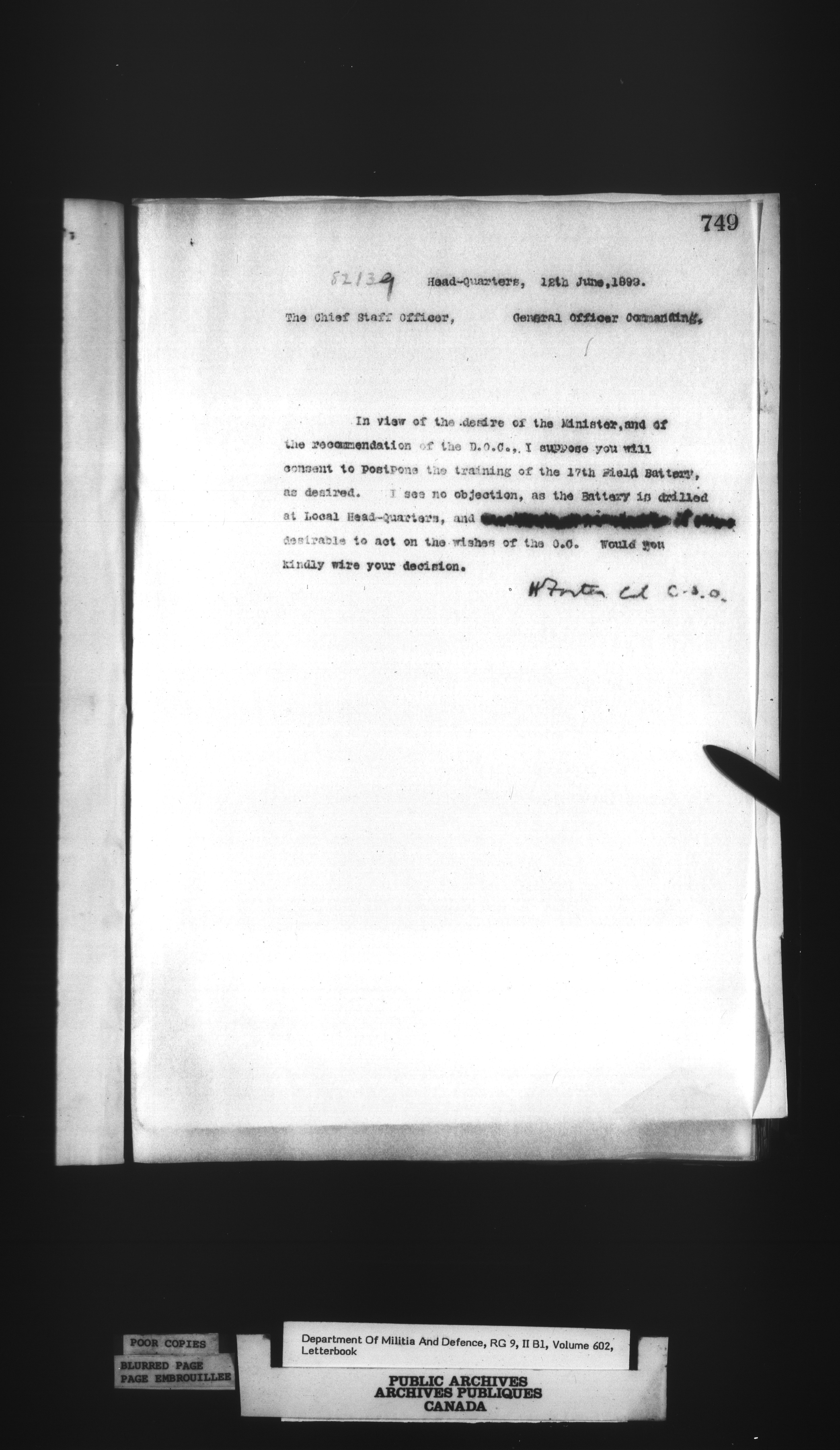 Correspondence of the General Officer Commanding (GOC) of the Canadian Militia and his predecessor, the Adjutant General - 344