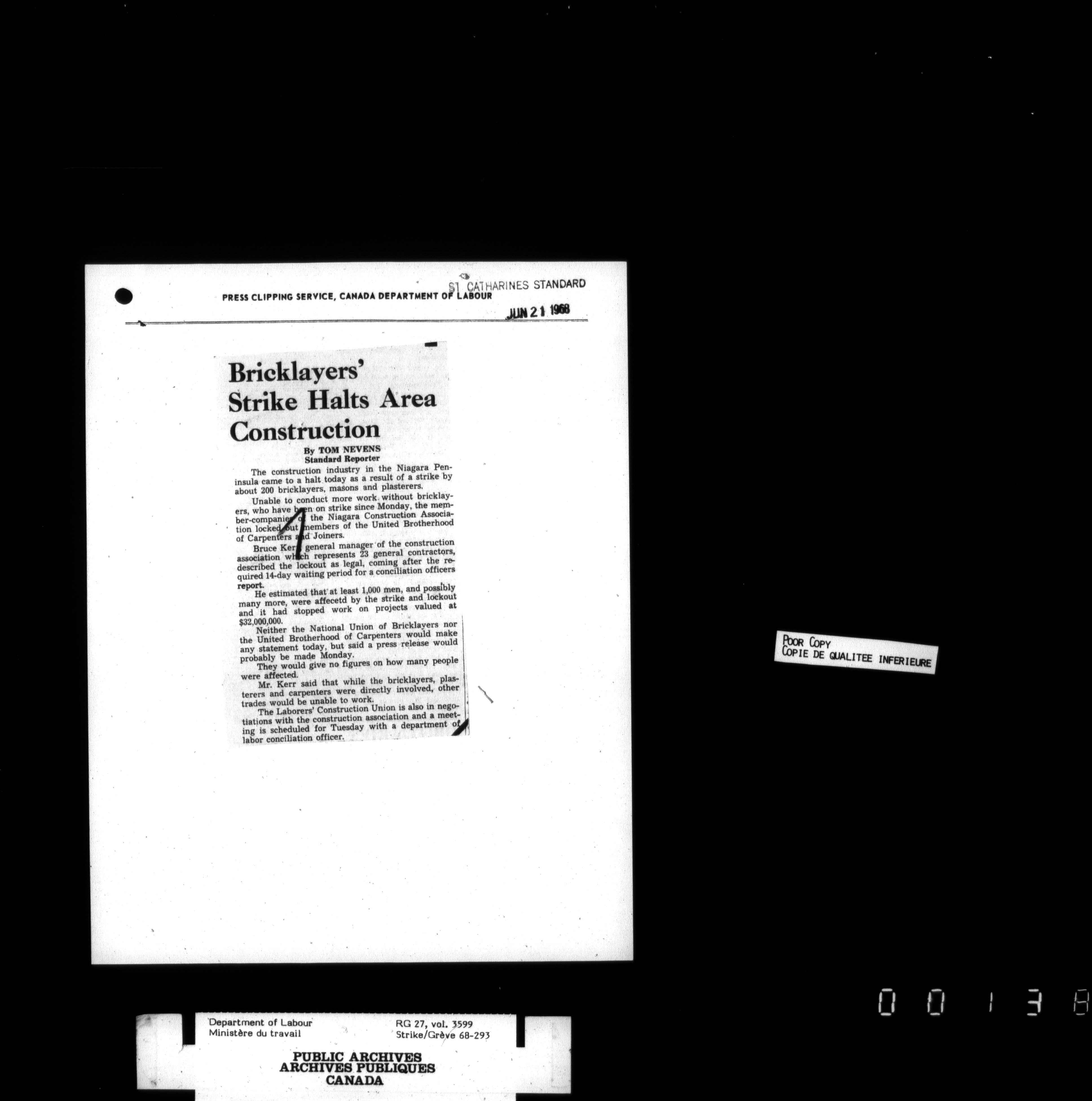 Department of Labour, Economics and Research Branch : Strikes and lockout files : T-3443