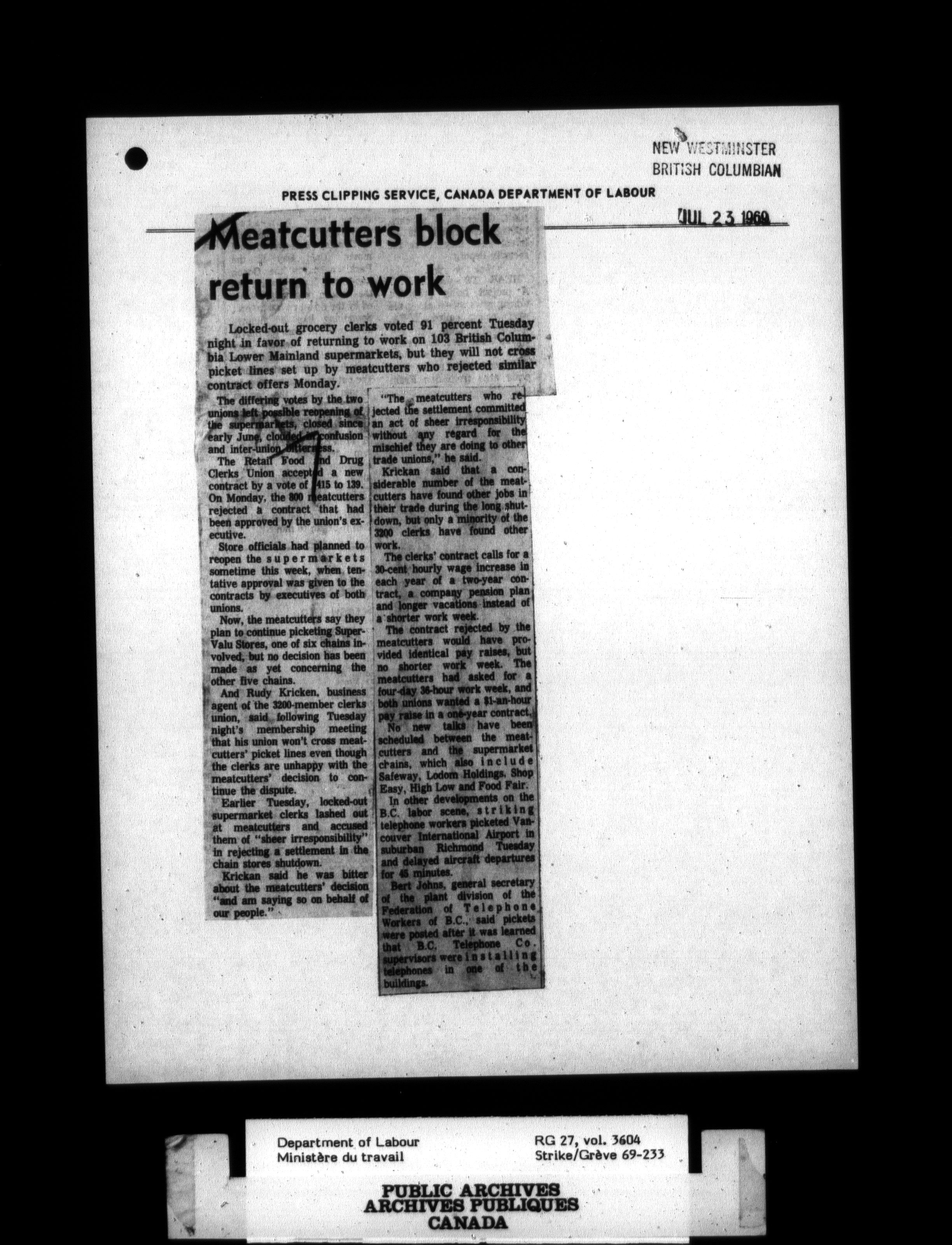 Department of Labour, Economics and Research Branch : Strikes and lockout files : T-3447