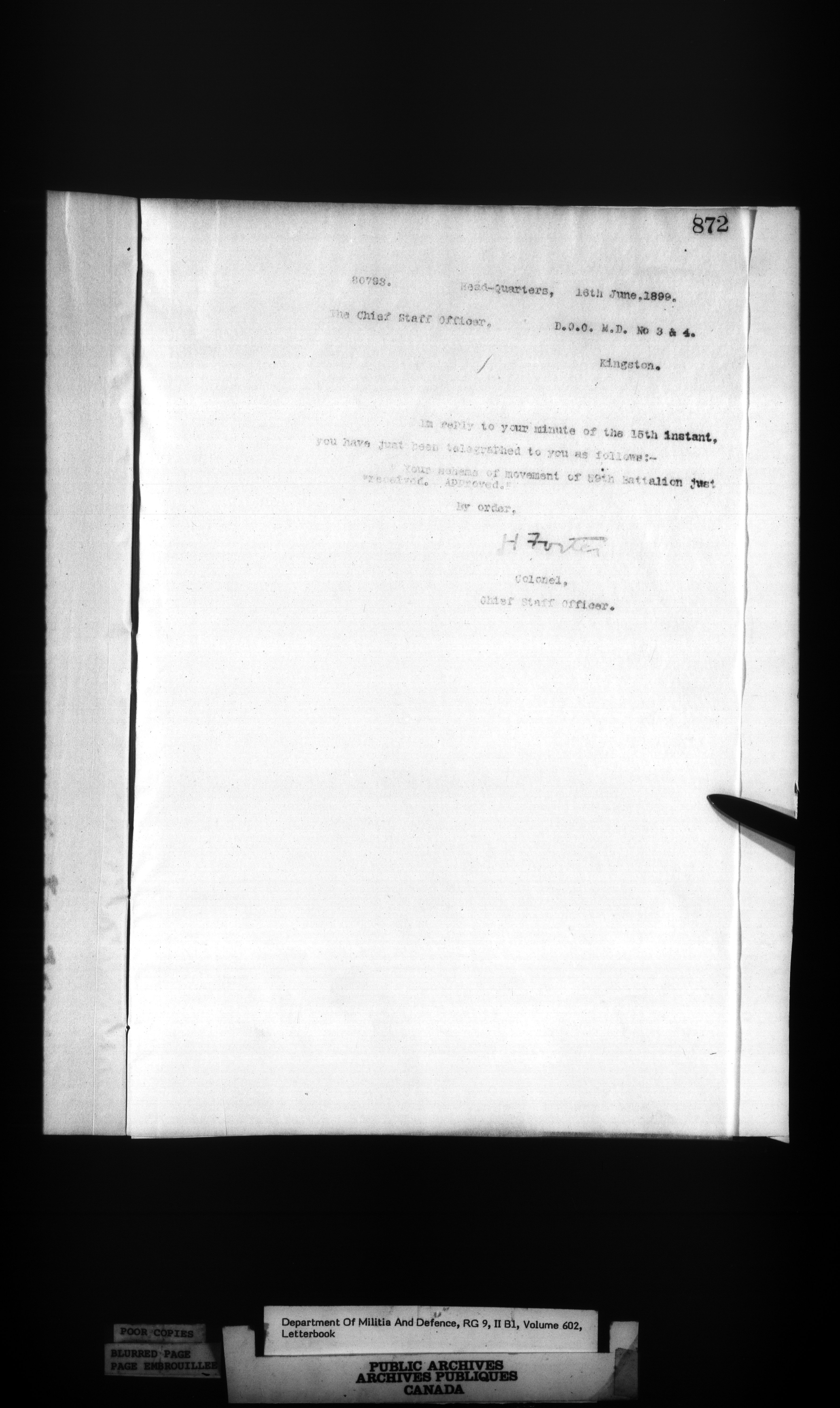 Correspondence of the General Officer Commanding (GOC) of the Canadian Militia and his predecessor, the Adjutant General - 345