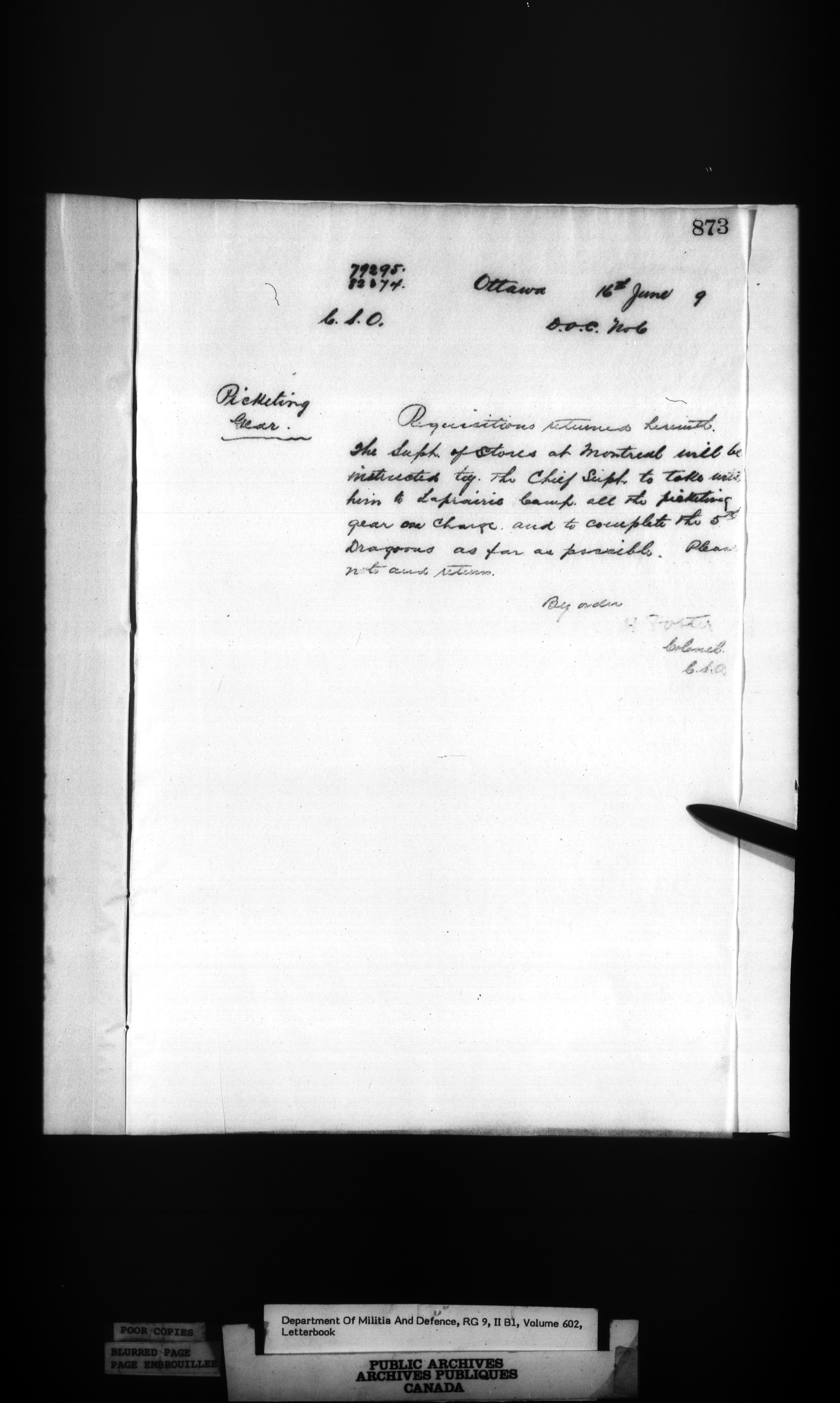 Correspondence of the General Officer Commanding (GOC) of the Canadian Militia and his predecessor, the Adjutant General - 345