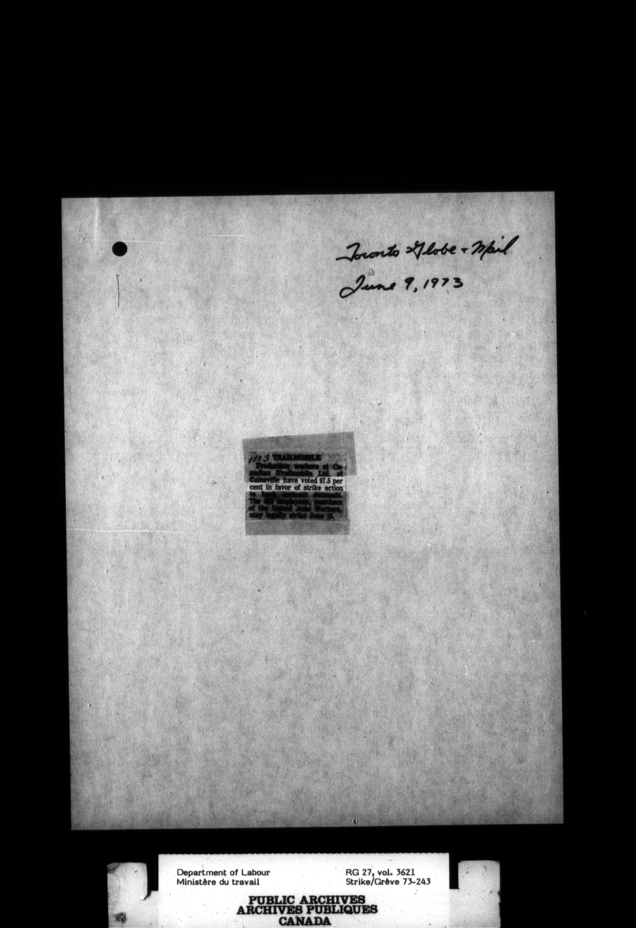 Department of Labour, Economics and Research Branch : Strikes and lockout files : T-3458