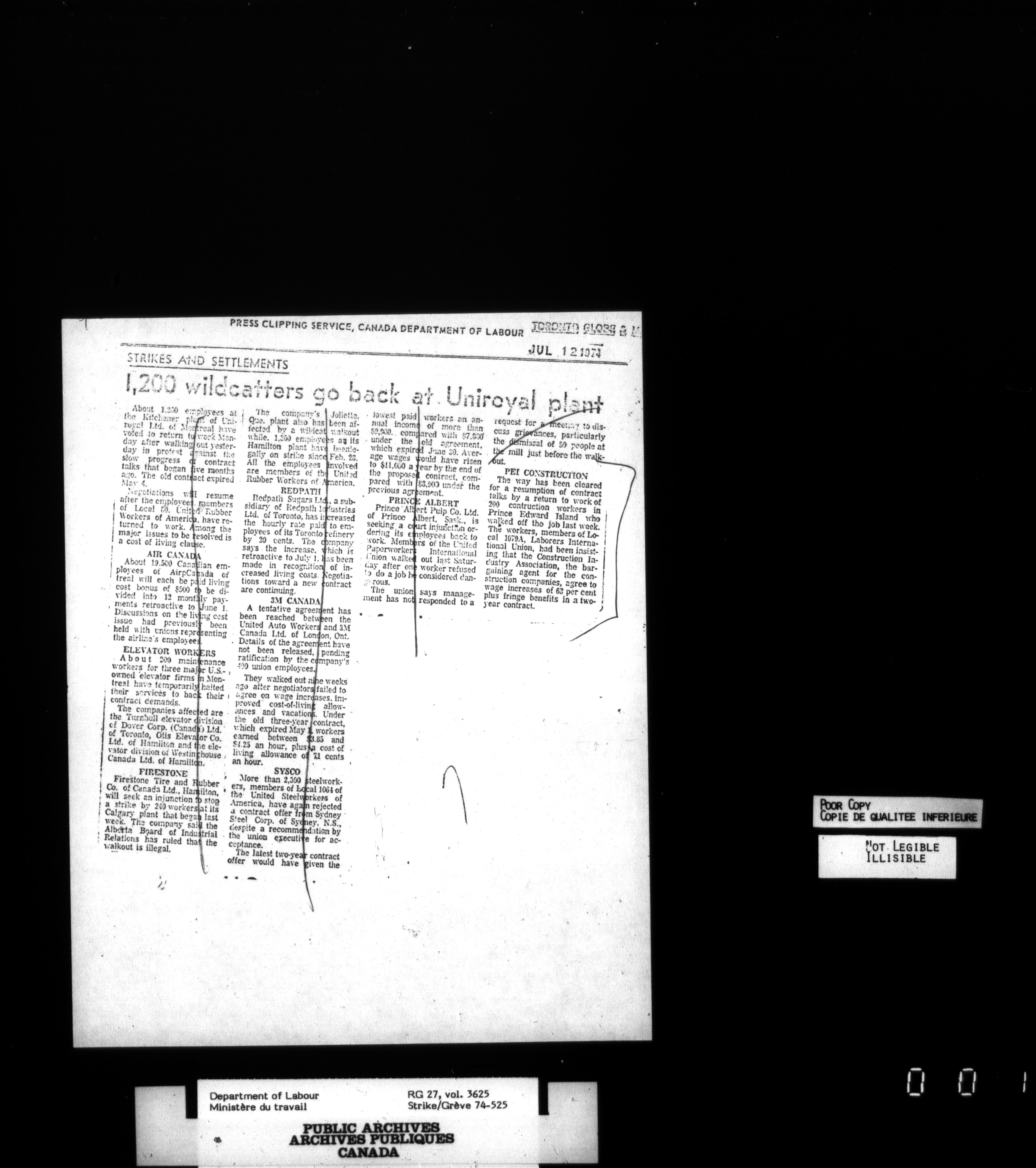 Department of Labour, Economics and Research Branch : Strikes and lockout files : T-3459