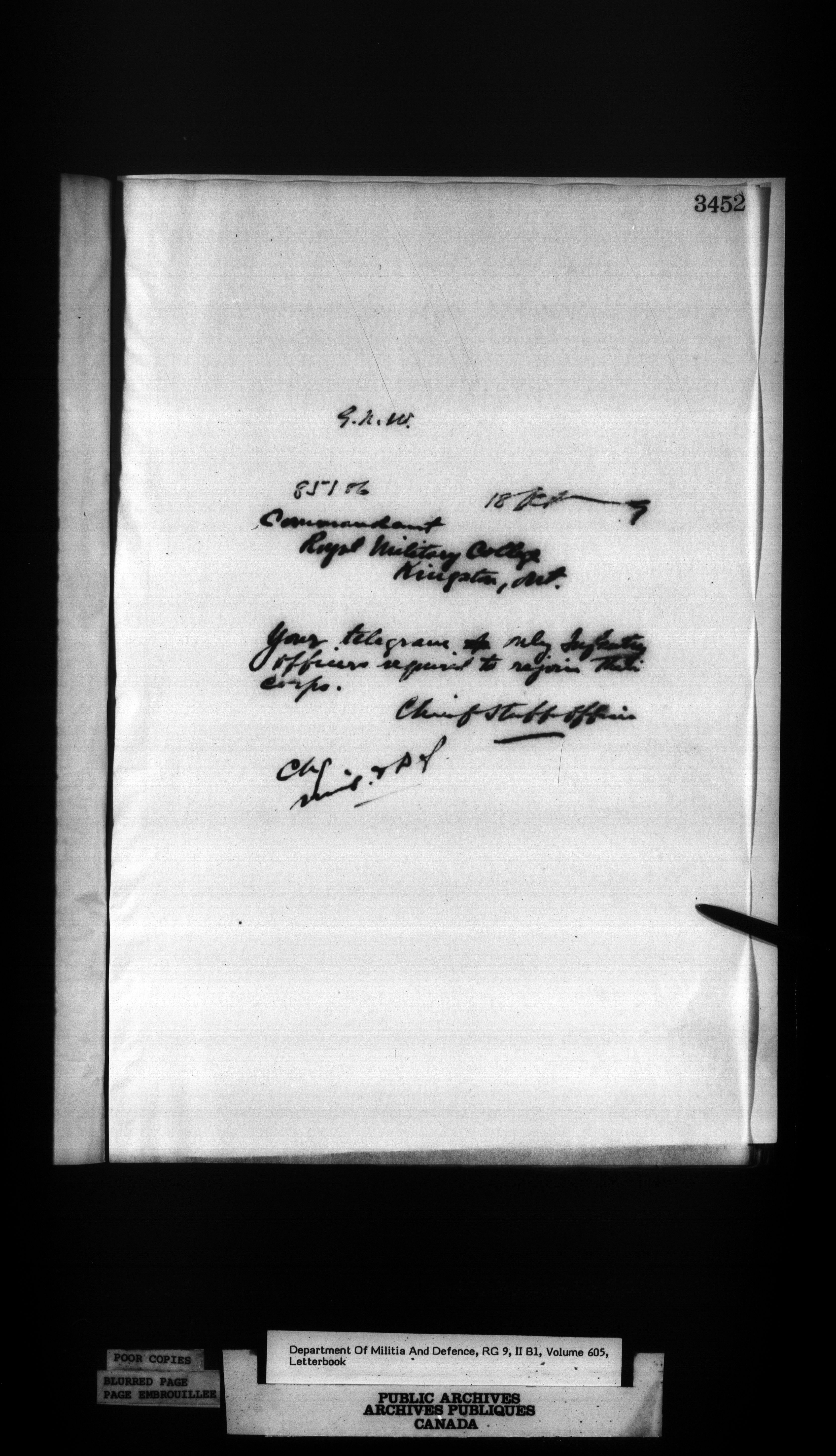 Correspondence of the General Officer Commanding (GOC) of the Canadian Militia and his predecessor, the Adjutant General : T-346
