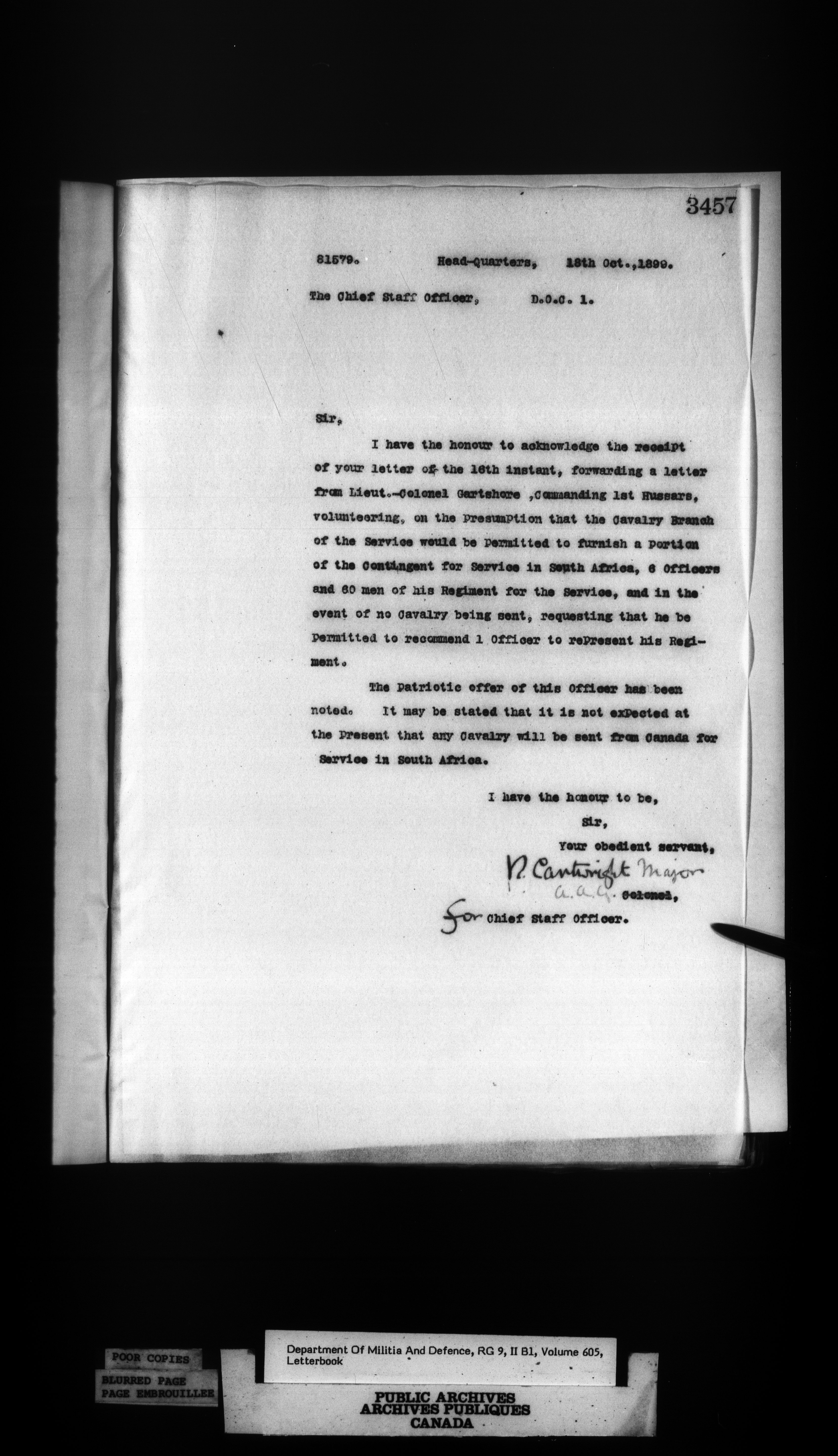 Correspondence of the General Officer Commanding (GOC) of the Canadian Militia and his predecessor, the Adjutant General - 346