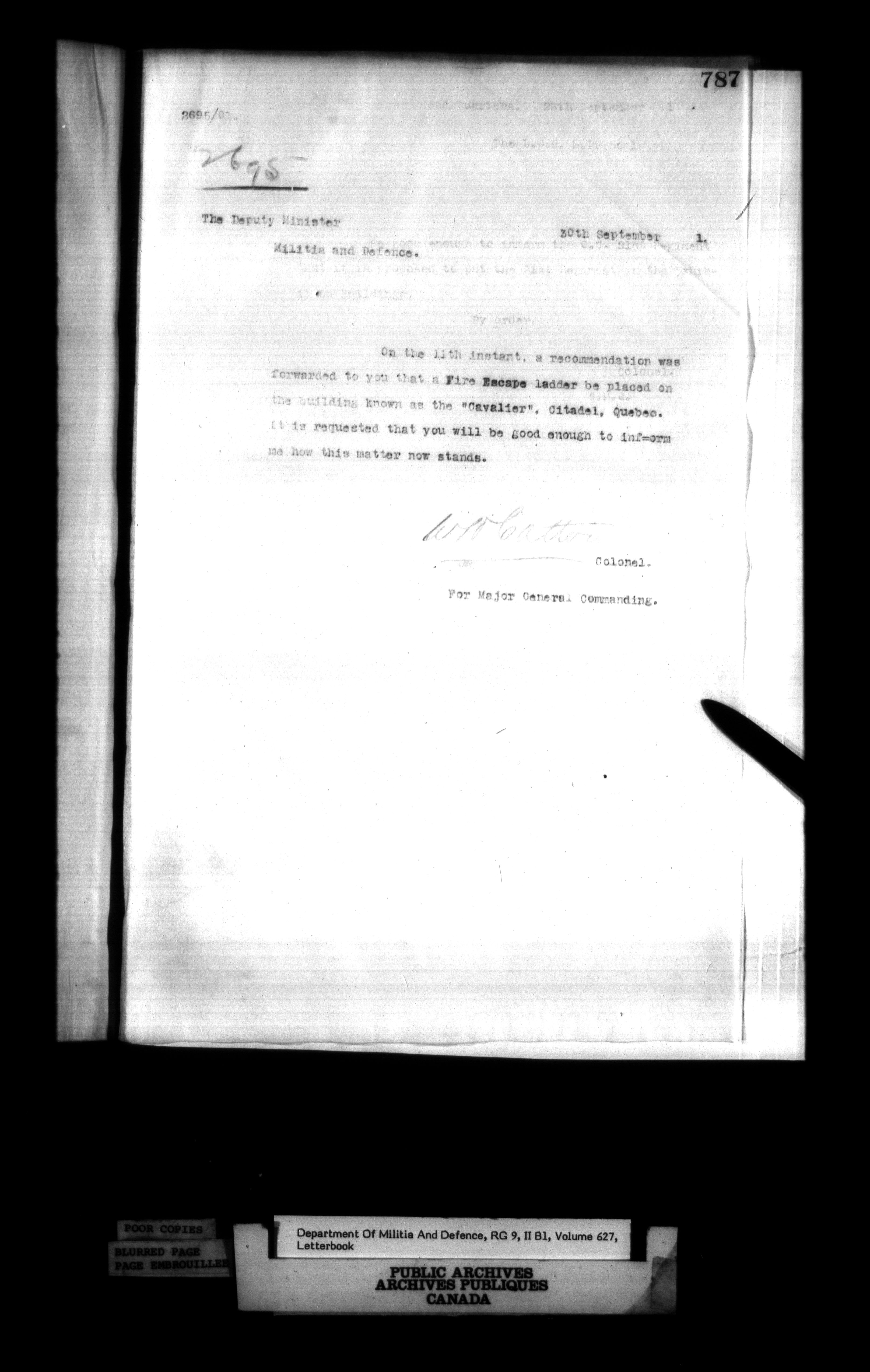 Correspondence of the General Officer Commanding (GOC) of the Canadian Militia and his predecessor, the Adjutant General - 362