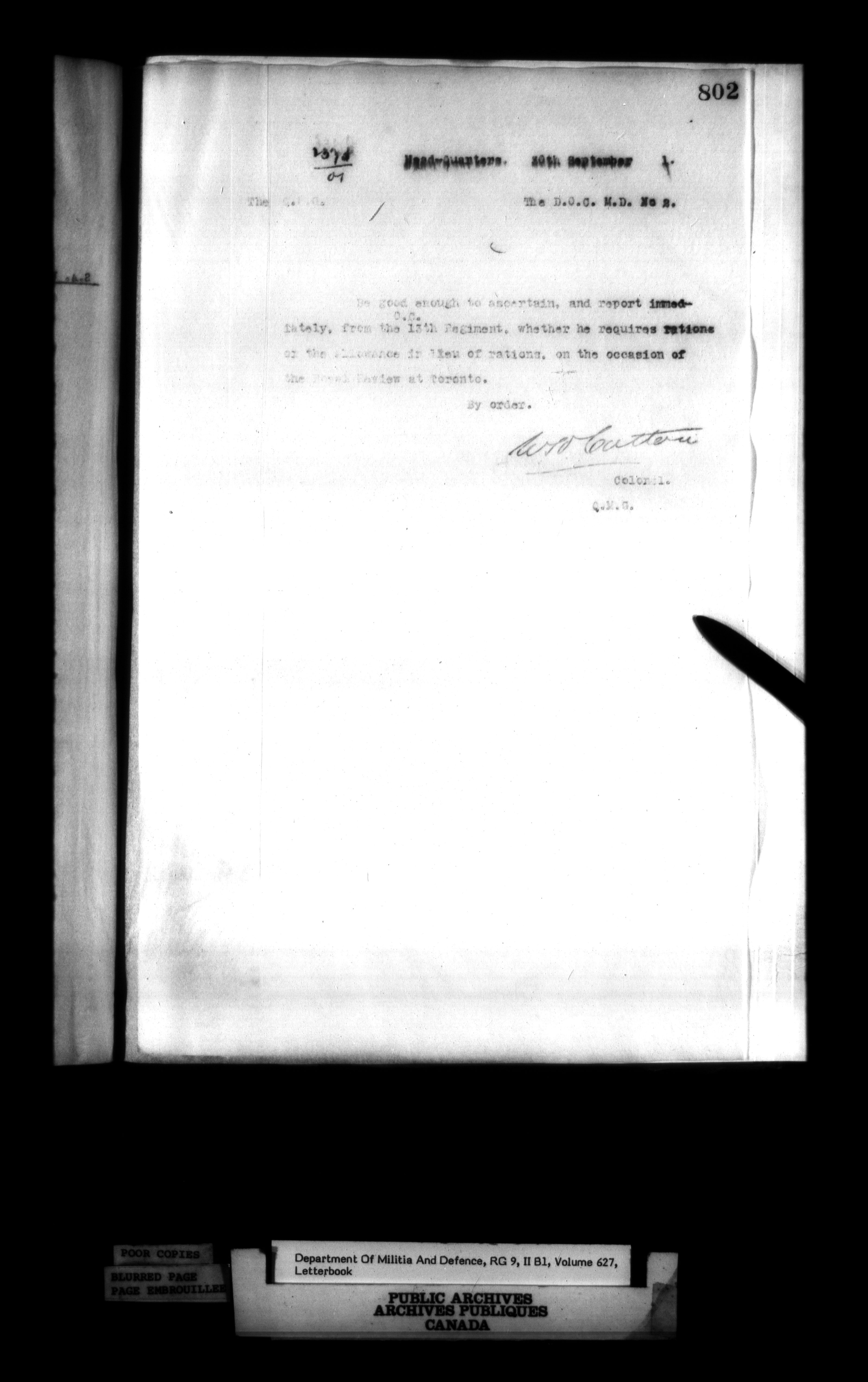 Correspondence of the General Officer Commanding (GOC) of the Canadian Militia and his predecessor, the Adjutant General - 362