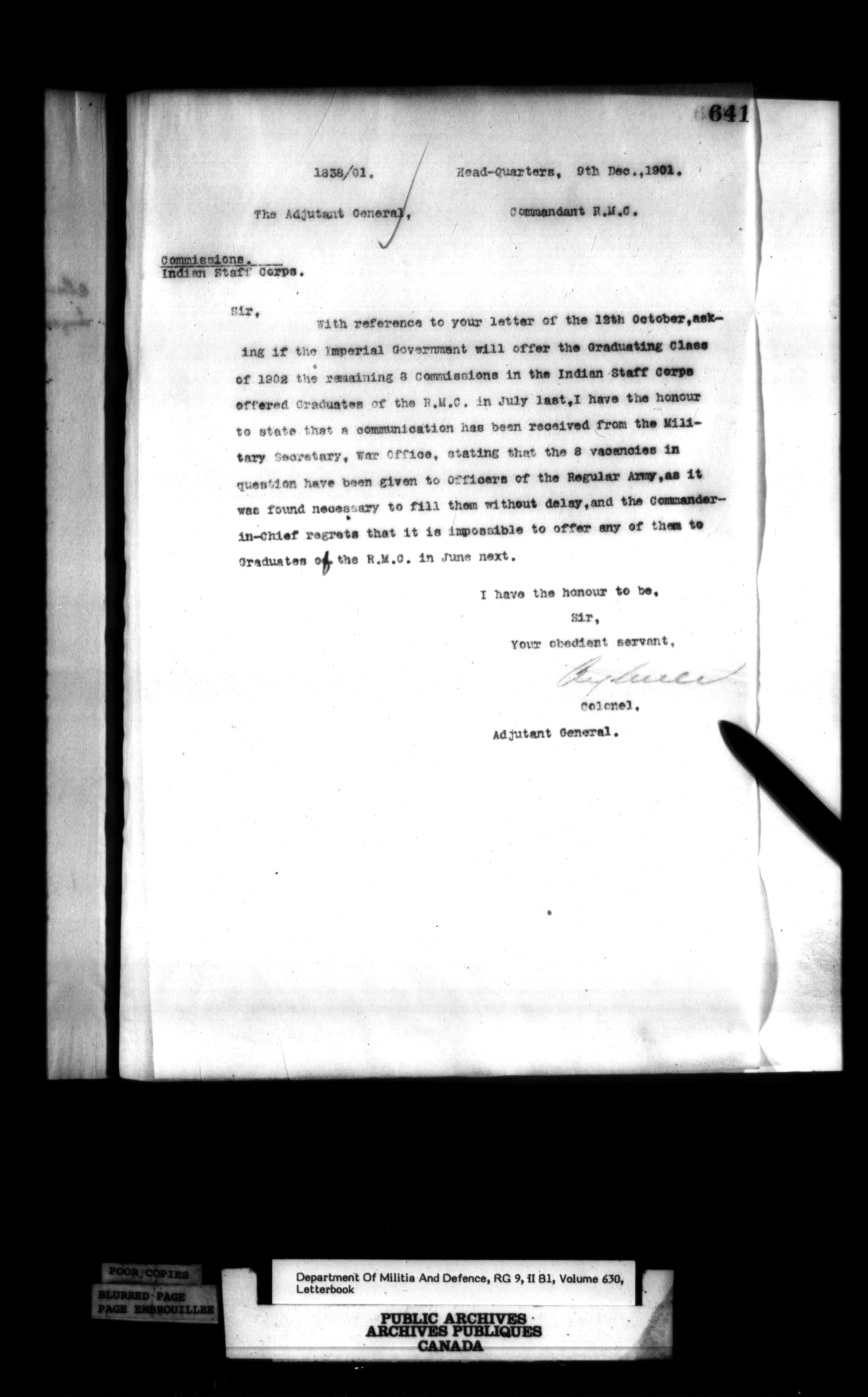 Correspondence of the General Officer Commanding (GOC) of the Canadian Militia and his predecessor, the Adjutant General - 363