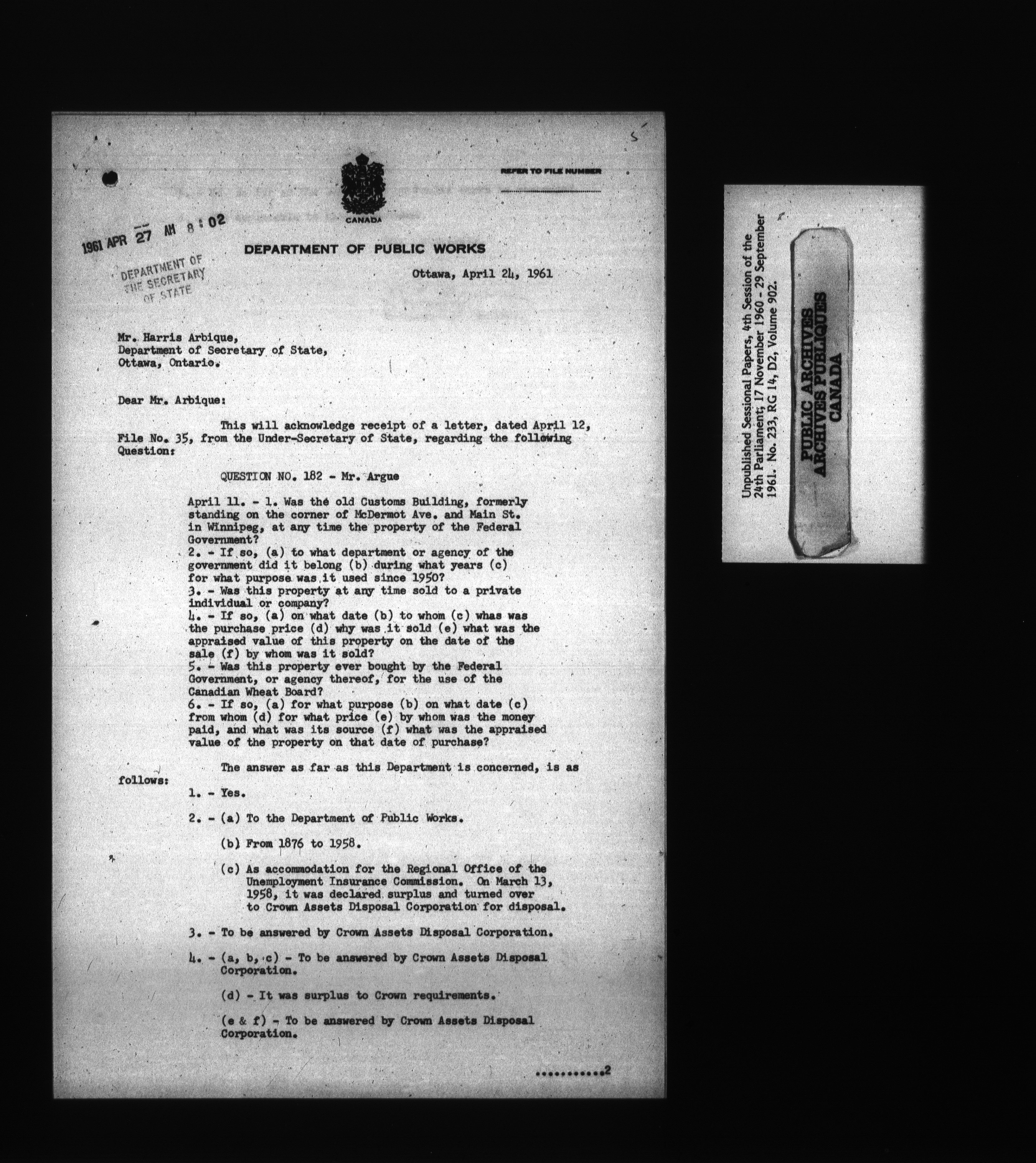 Unpublished sessional papers, 4th Session, 24th Parliament - 3645