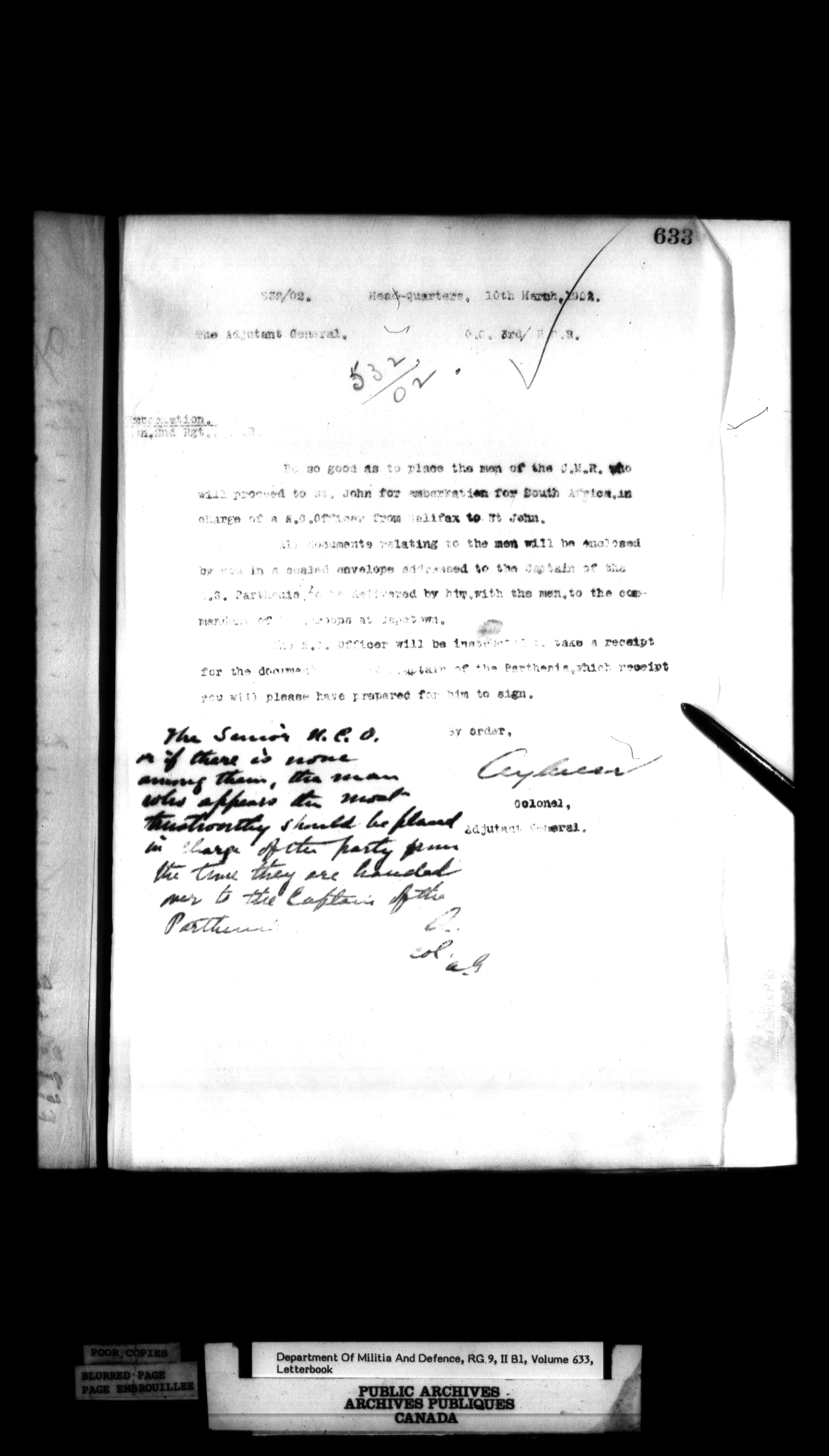 Correspondence of the General Officer Commanding (GOC) of the Canadian Militia and his predecessor, the Adjutant General - 366