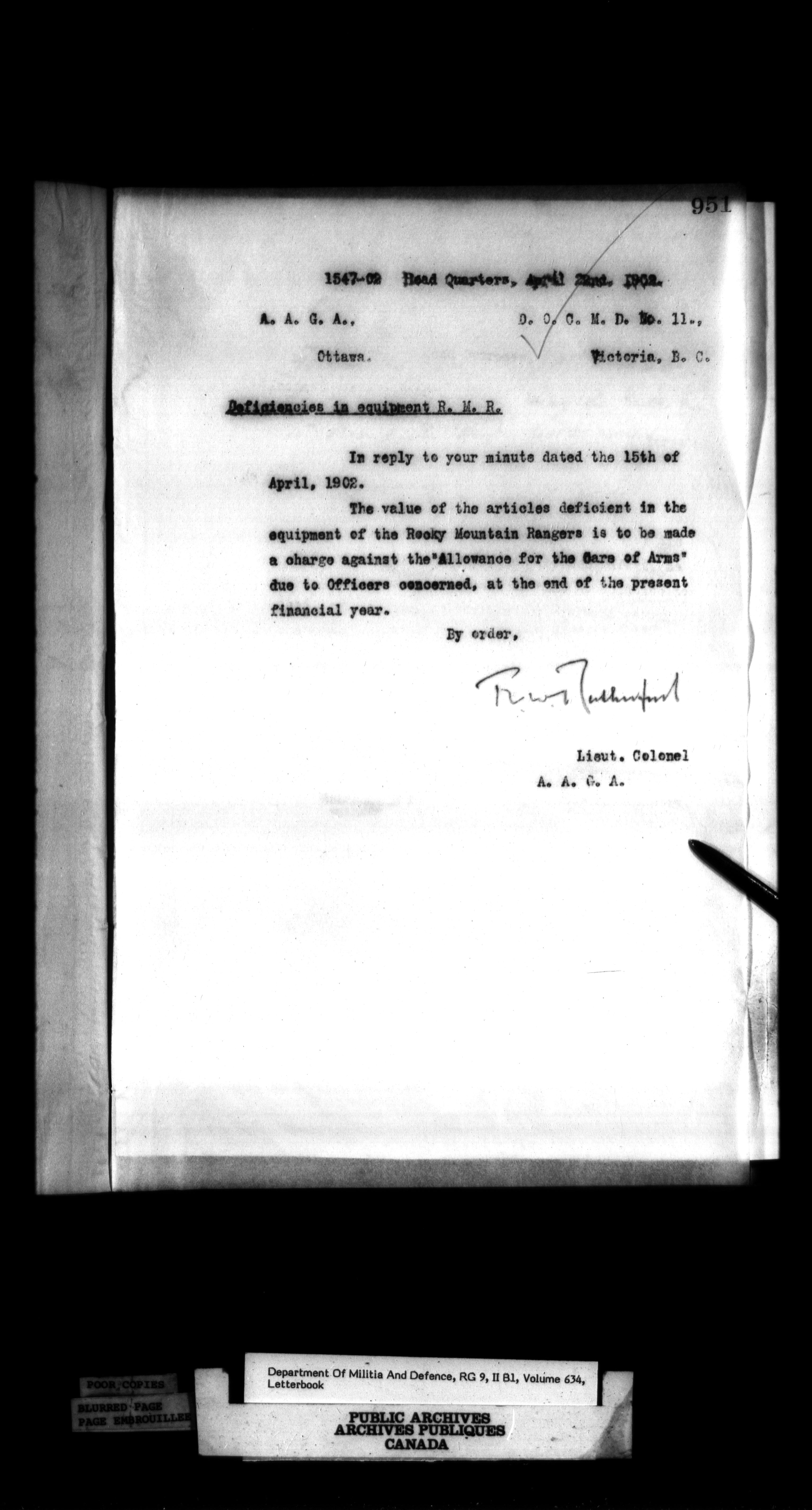 Correspondence of the General Officer Commanding (GOC) of the Canadian Militia and his predecessor, the Adjutant General - 366