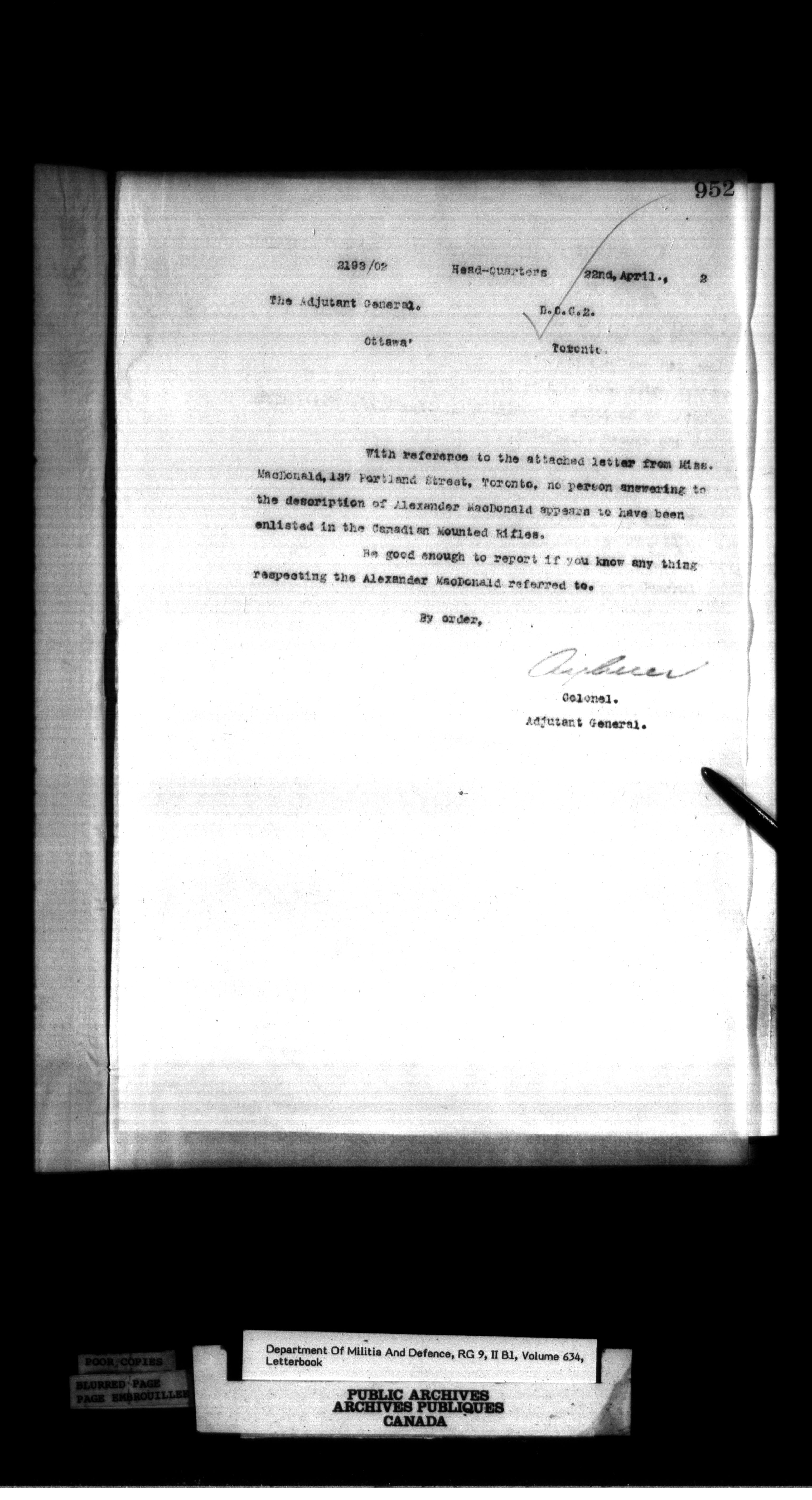 Correspondence of the General Officer Commanding (GOC) of the Canadian Militia and his predecessor, the Adjutant General - 366