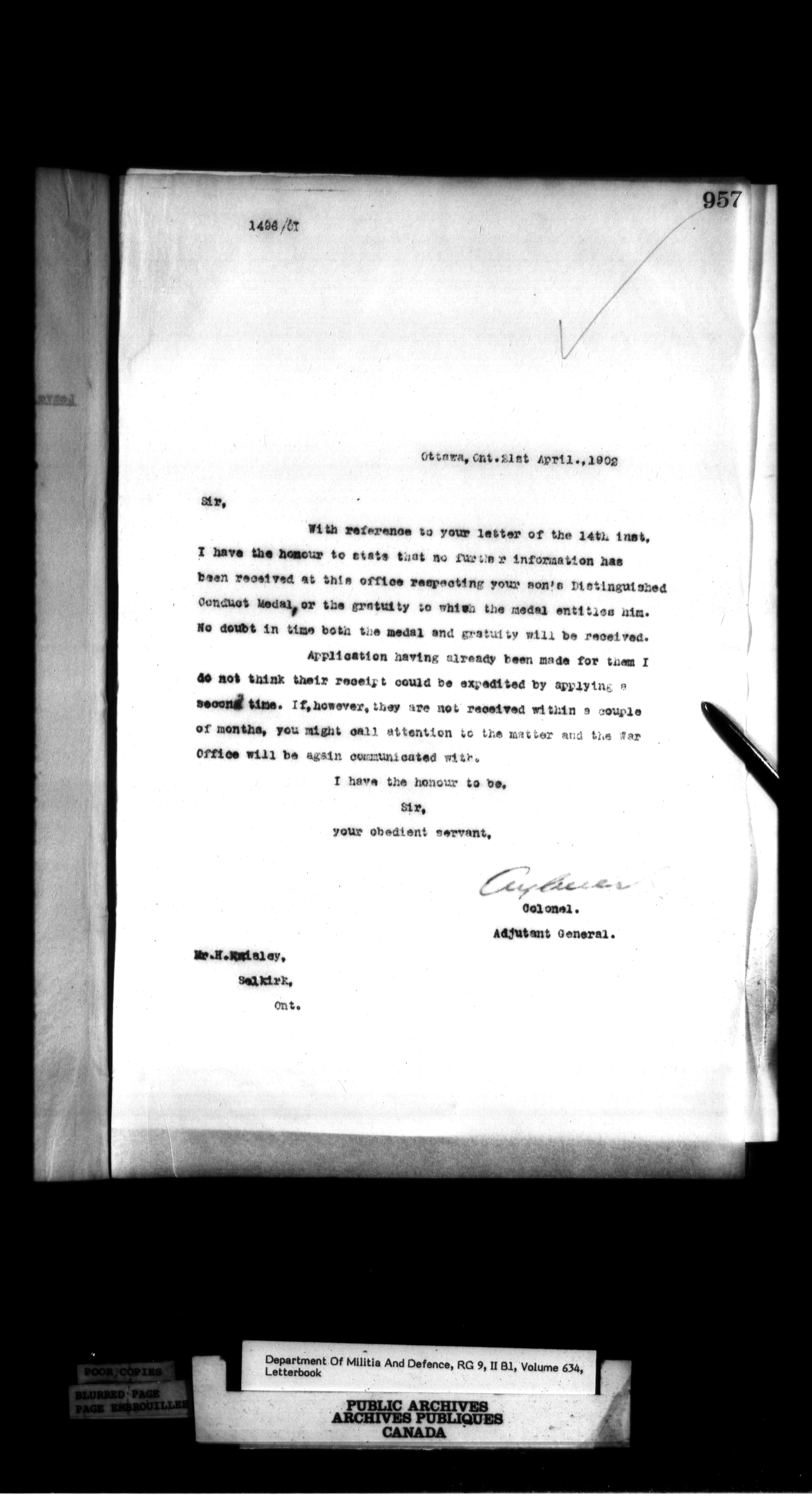 Correspondence of the General Officer Commanding (GOC) of the Canadian Militia and his predecessor, the Adjutant General - 366