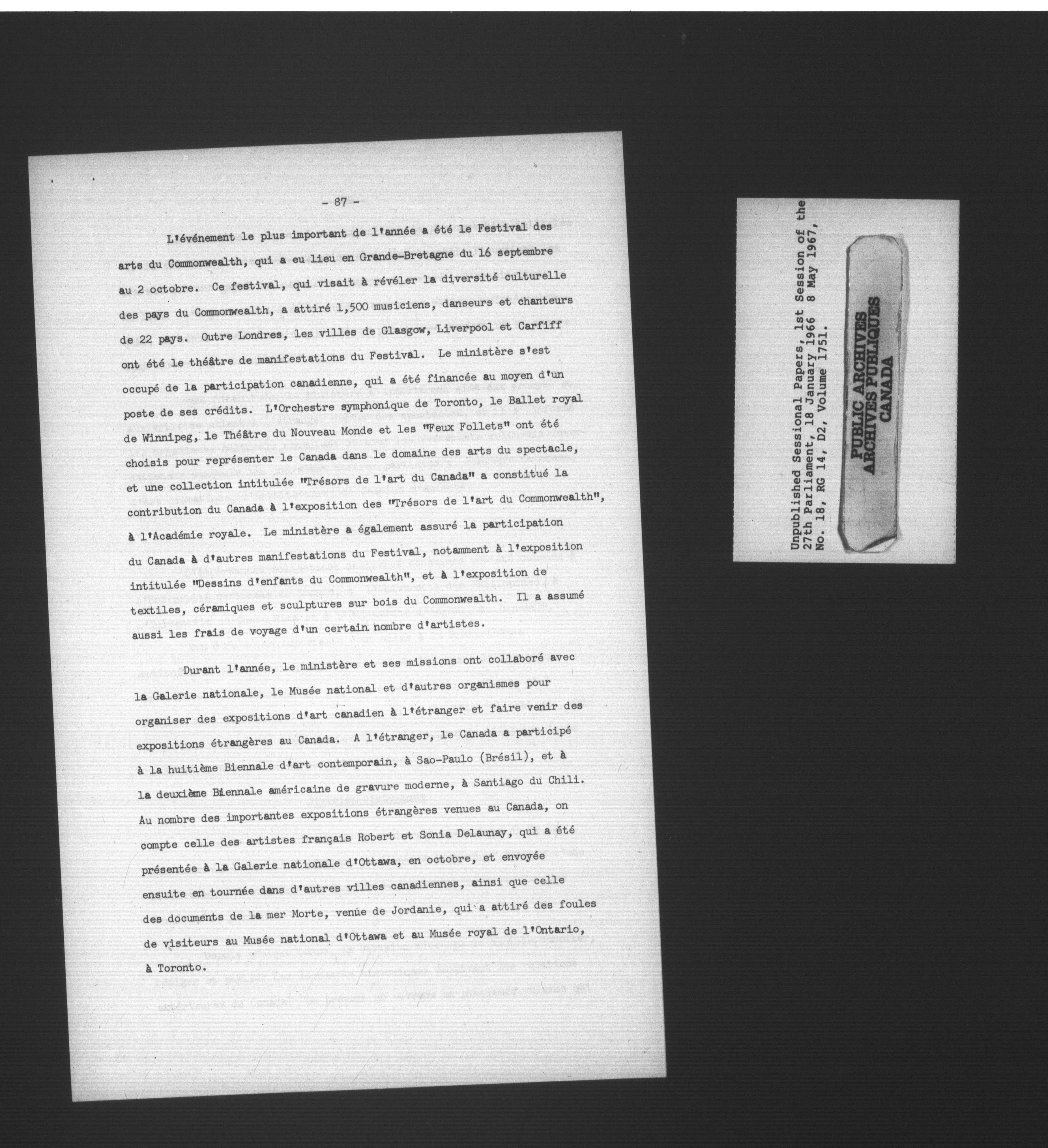 Unpublished sessional papers, 1st Session, 27th Parliament - 3689