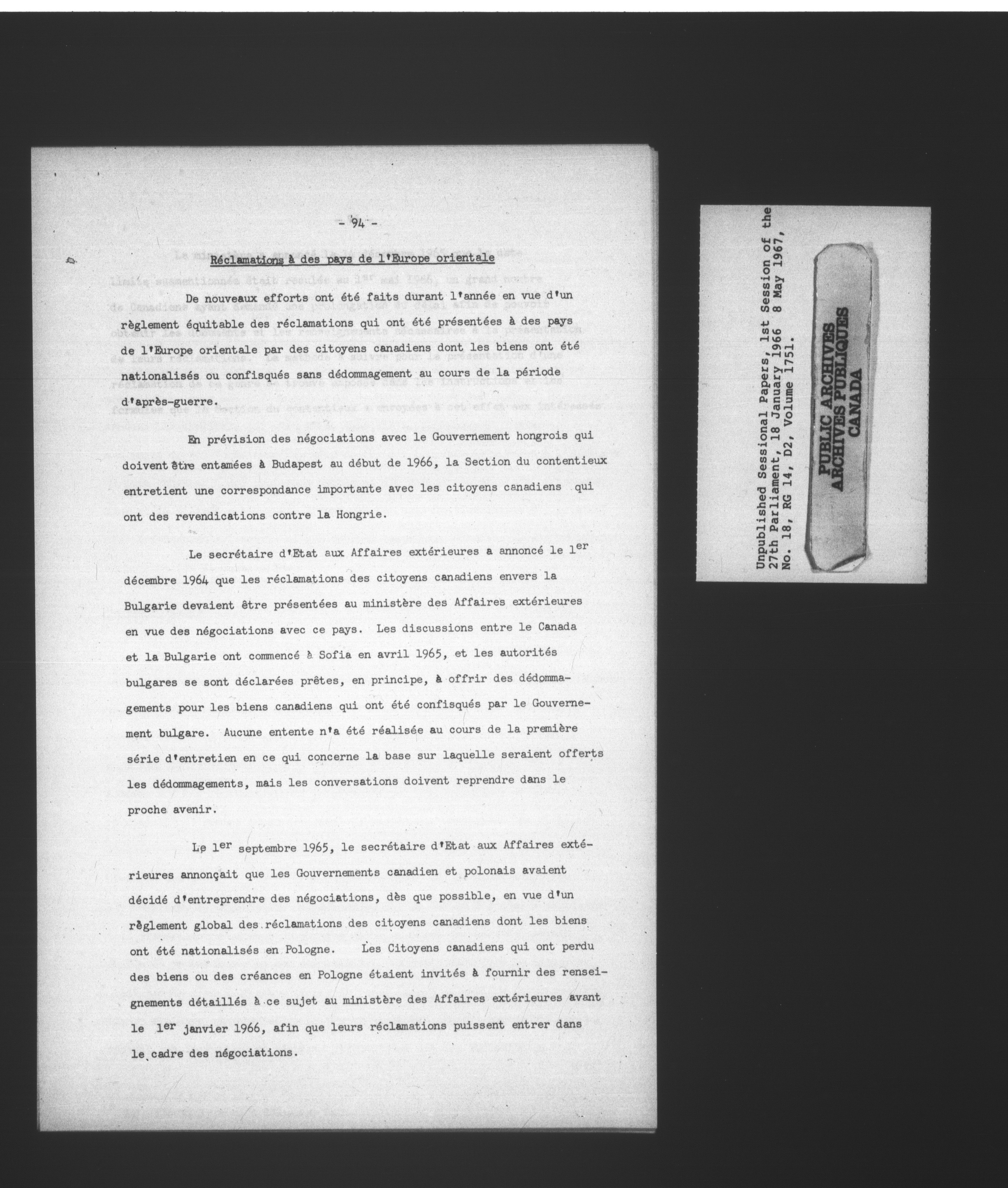 Unpublished sessional papers, 1st Session, 27th Parliament - 3689