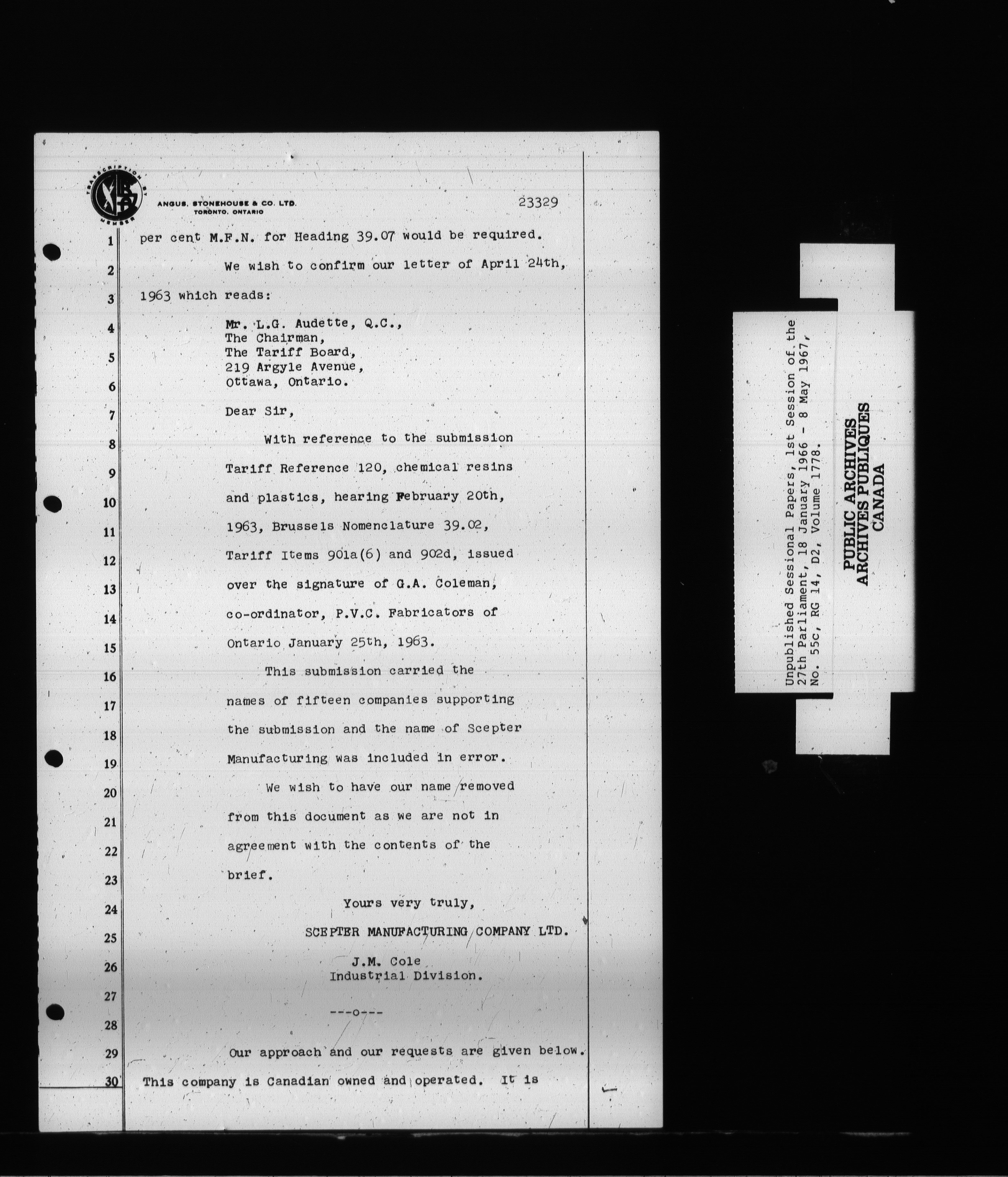 Unpublished sessional papers, 1st Session, 27th Parliament - 3707