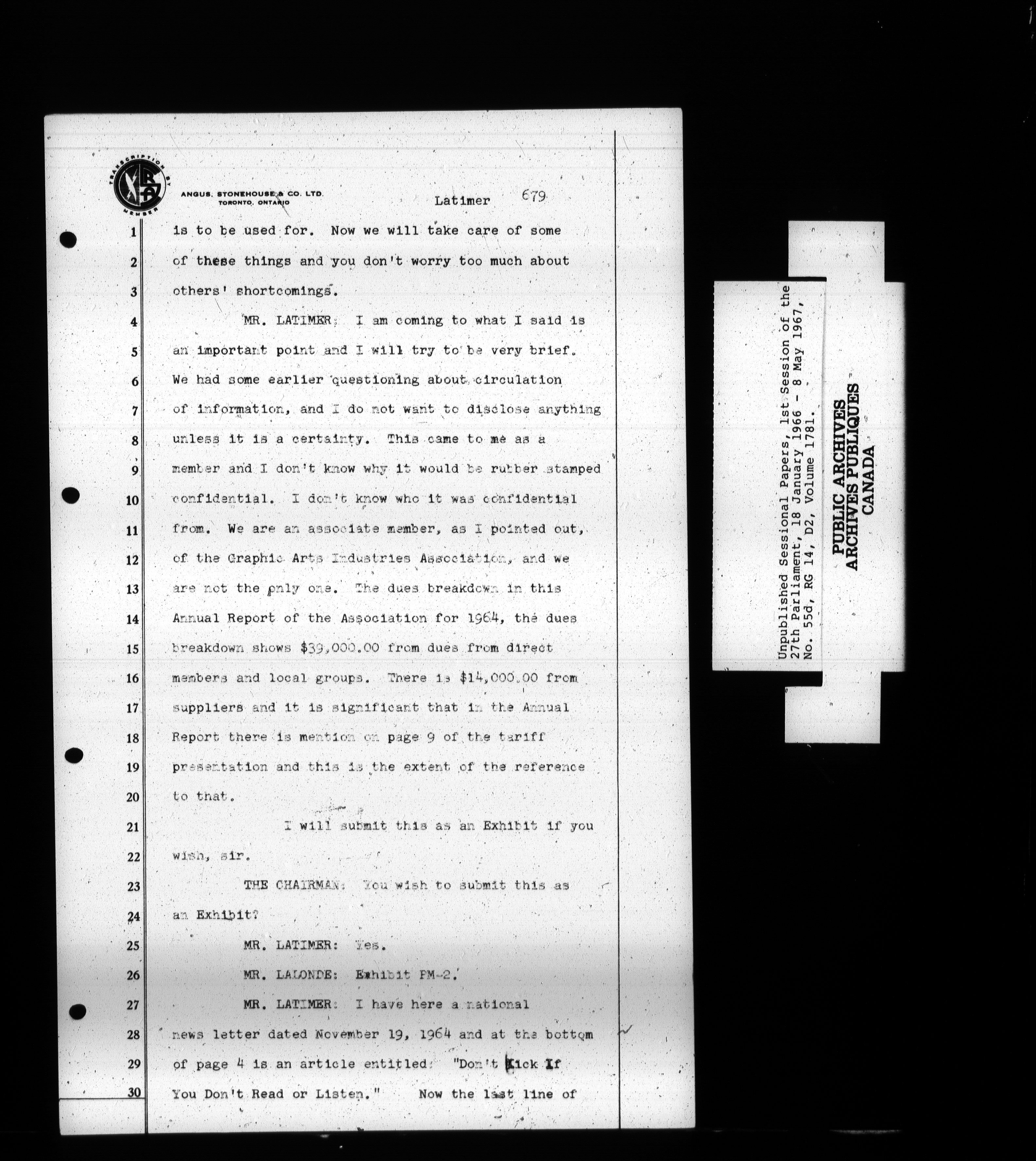 Unpublished sessional papers, 1st Session, 27th Parliament - 3709