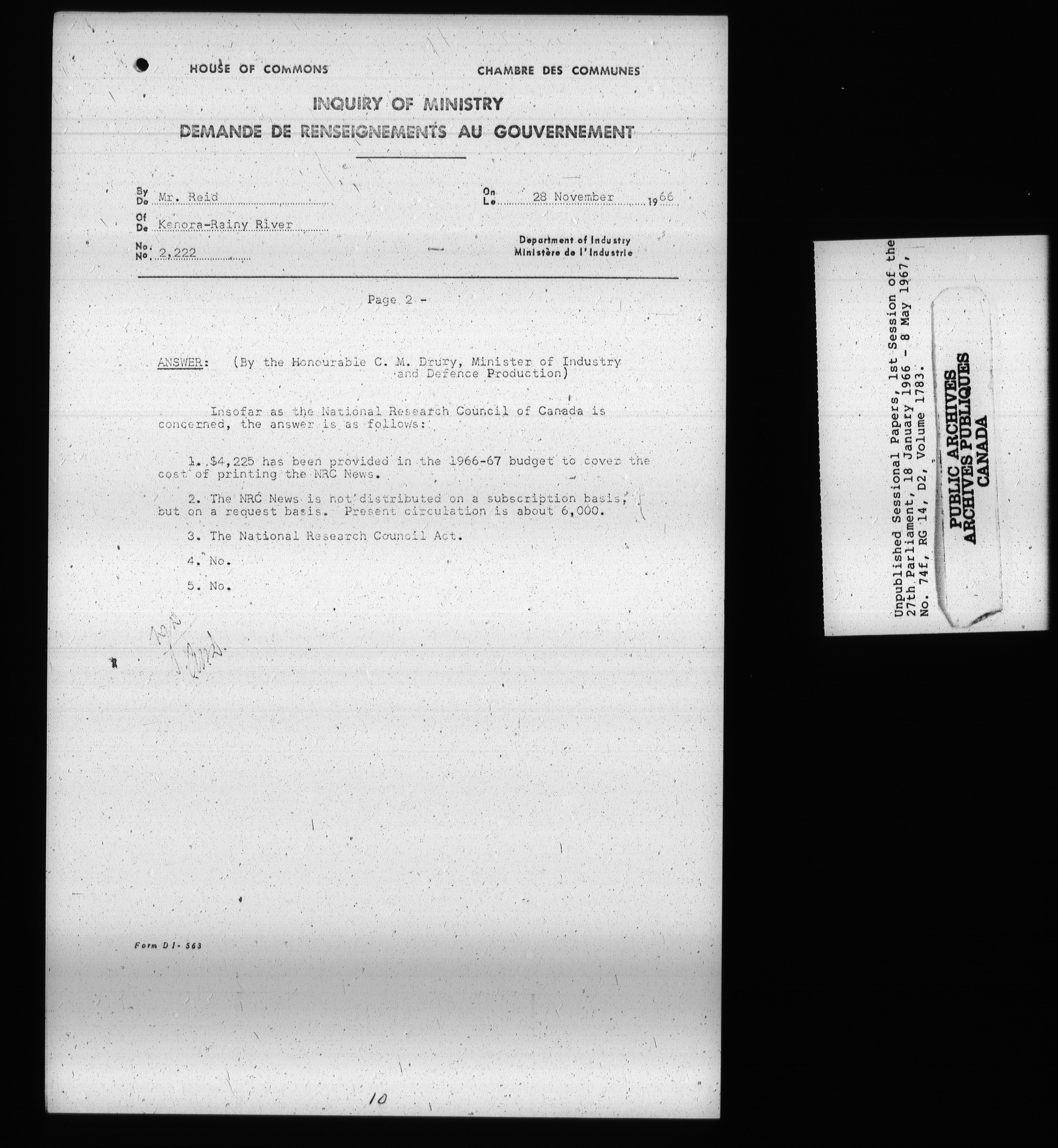 Unpublished sessional papers, 1st Session, 27th Parliament - 3710