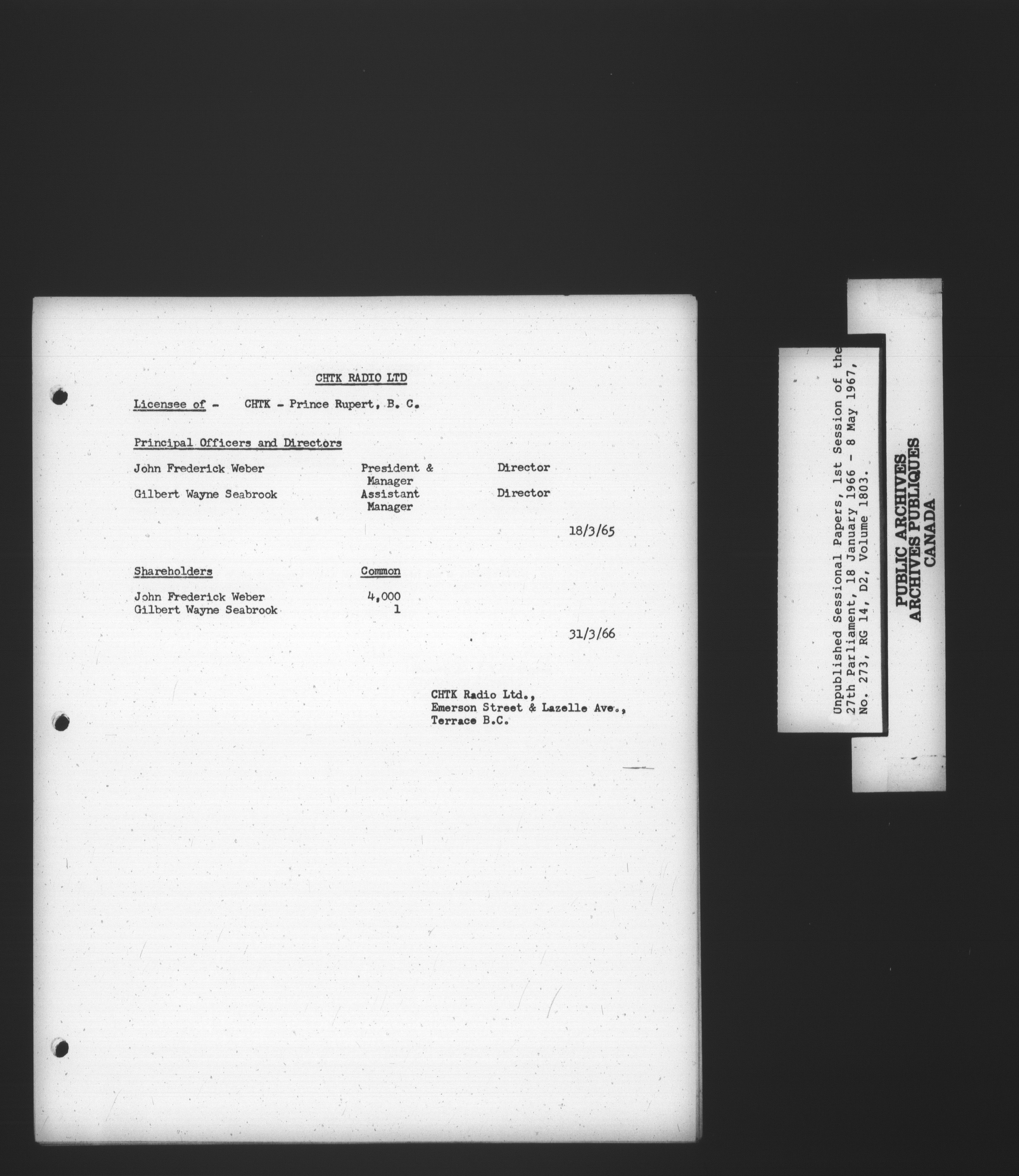 Unpublished sessional papers, 1st Session, 27th Parliament - 3724