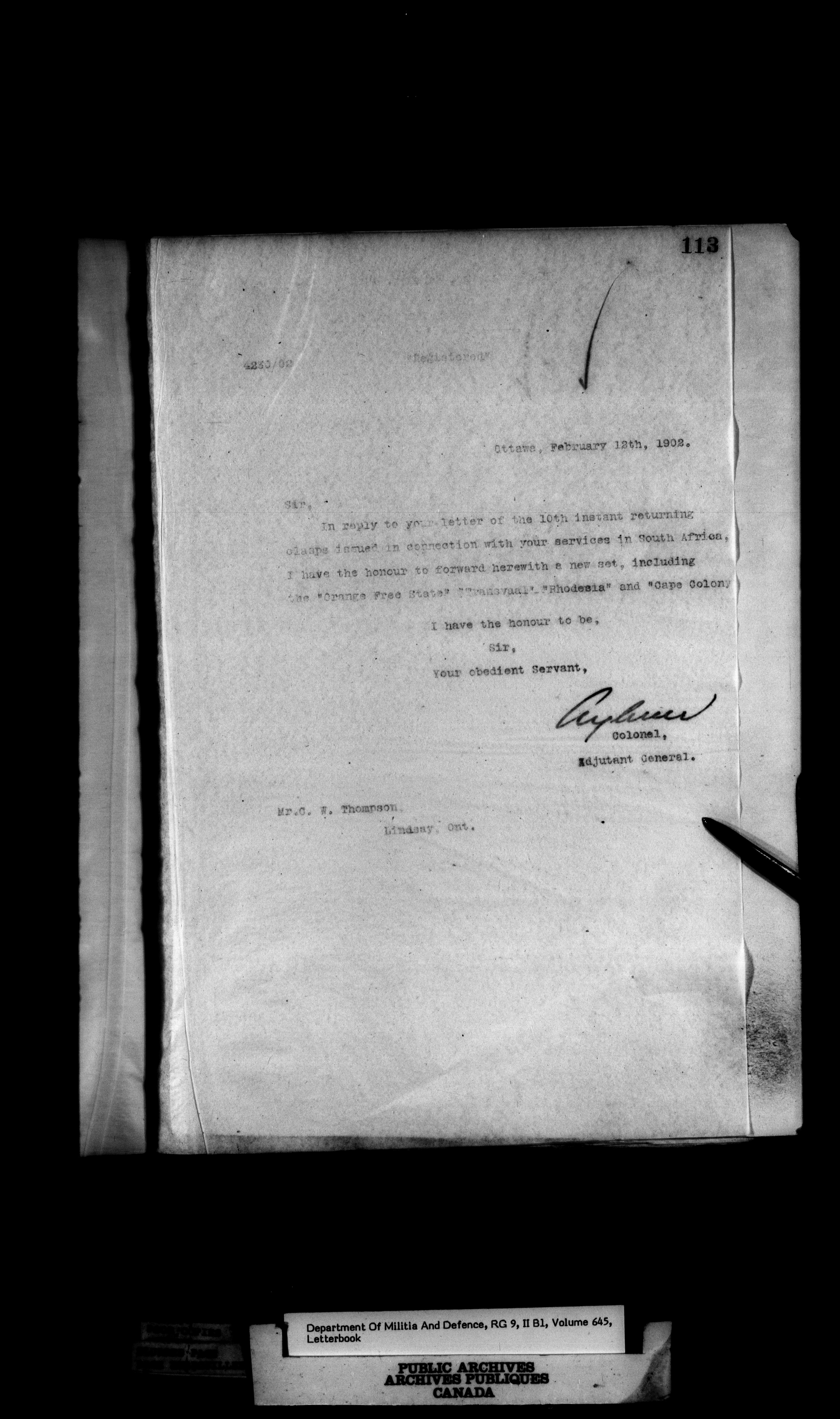 Correspondence of the General Officer Commanding (GOC) of the Canadian Militia and his predecessor, the Adjutant General : T-373