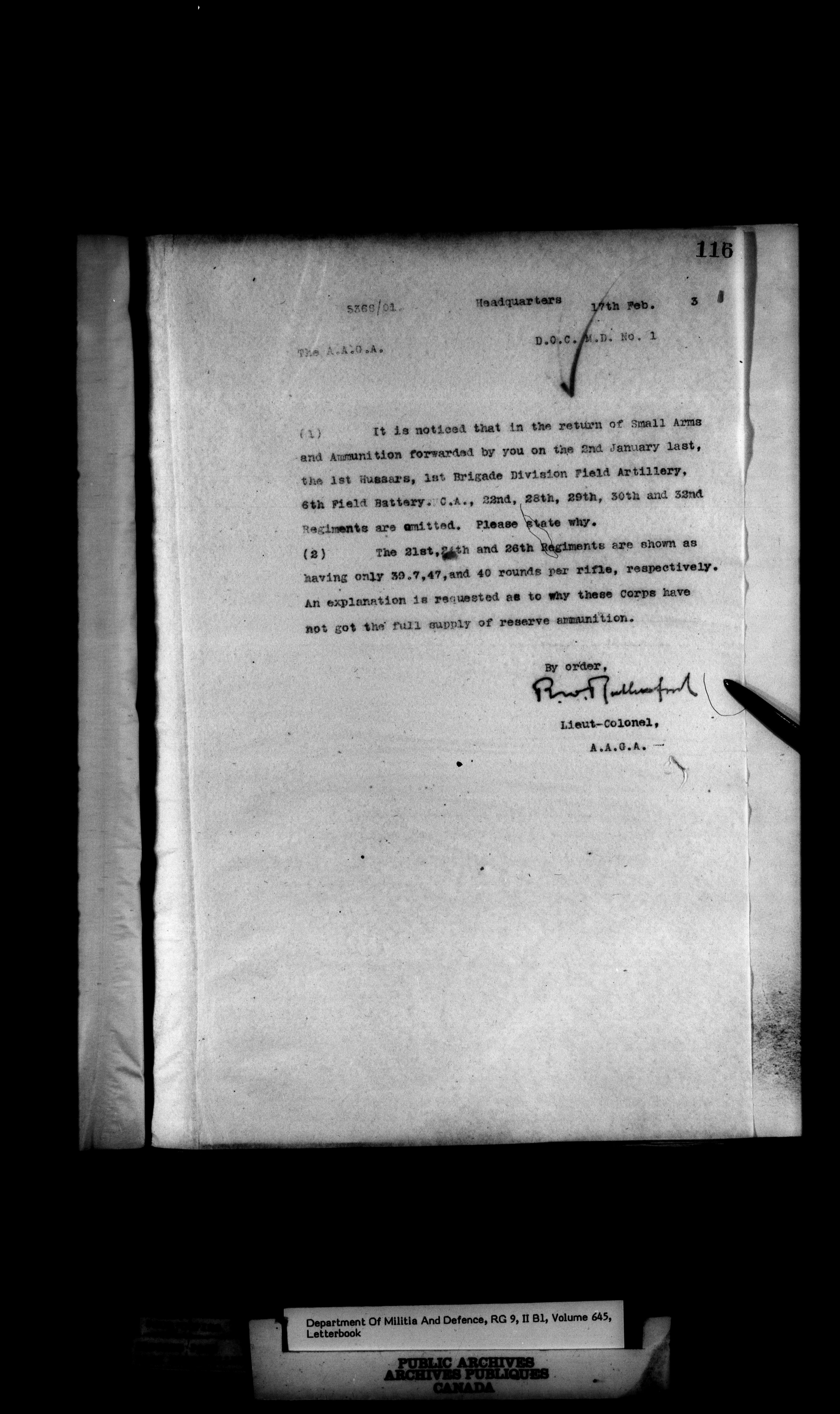 Correspondence of the General Officer Commanding (GOC) of the Canadian Militia and his predecessor, the Adjutant General - 373