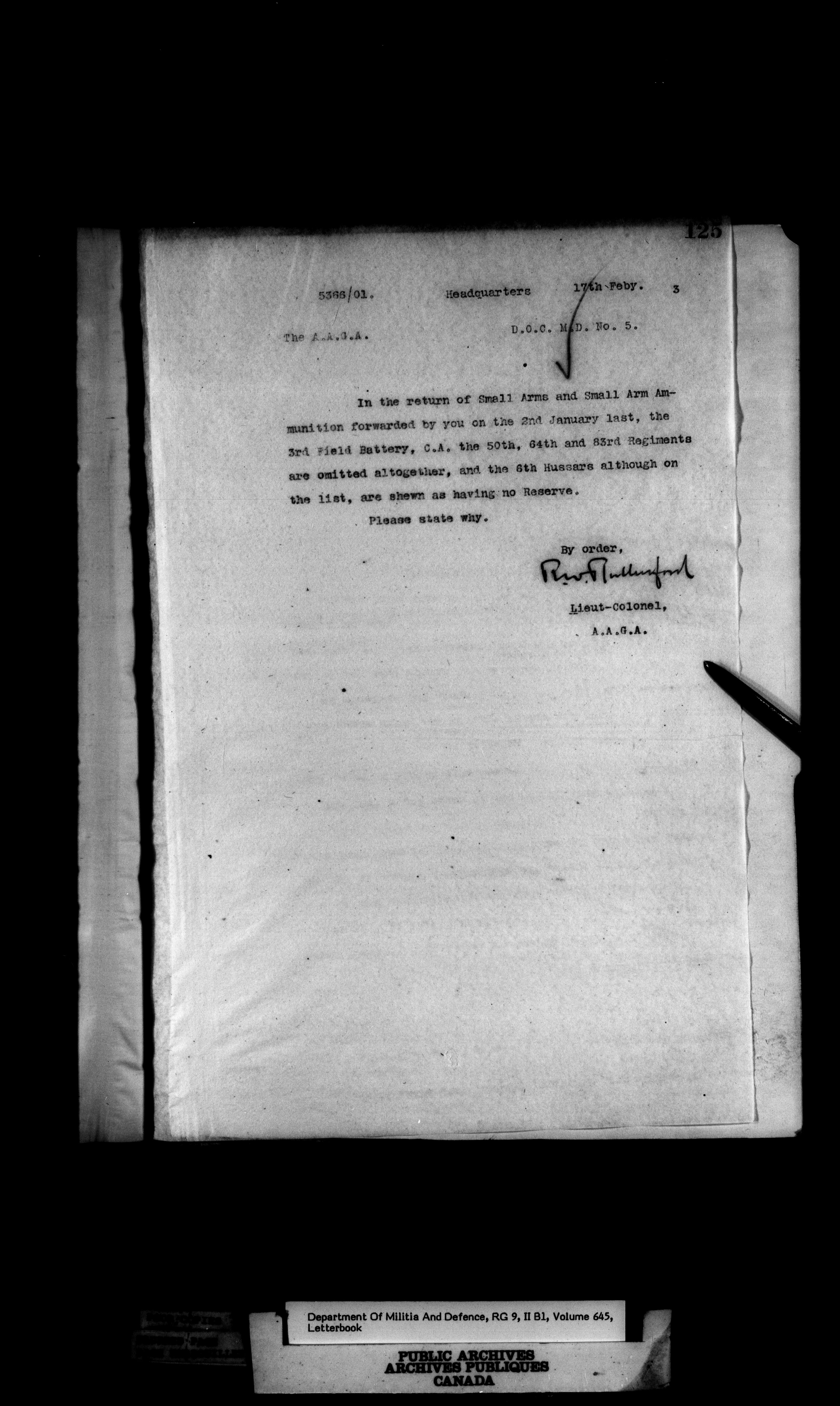 Correspondence of the General Officer Commanding (GOC) of the Canadian Militia and his predecessor, the Adjutant General - 373