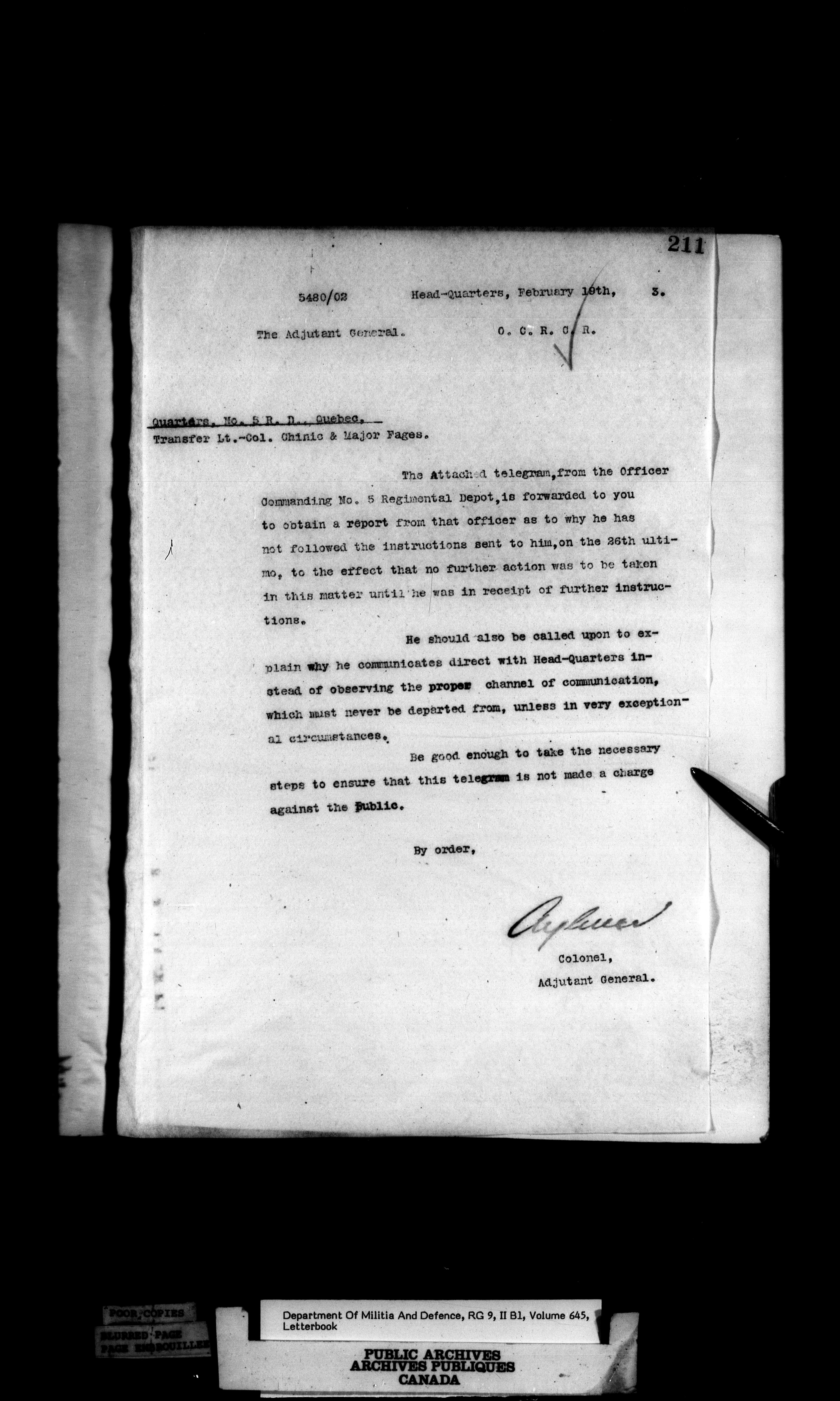 Correspondence of the General Officer Commanding (GOC) of the Canadian Militia and his predecessor, the Adjutant General - 374