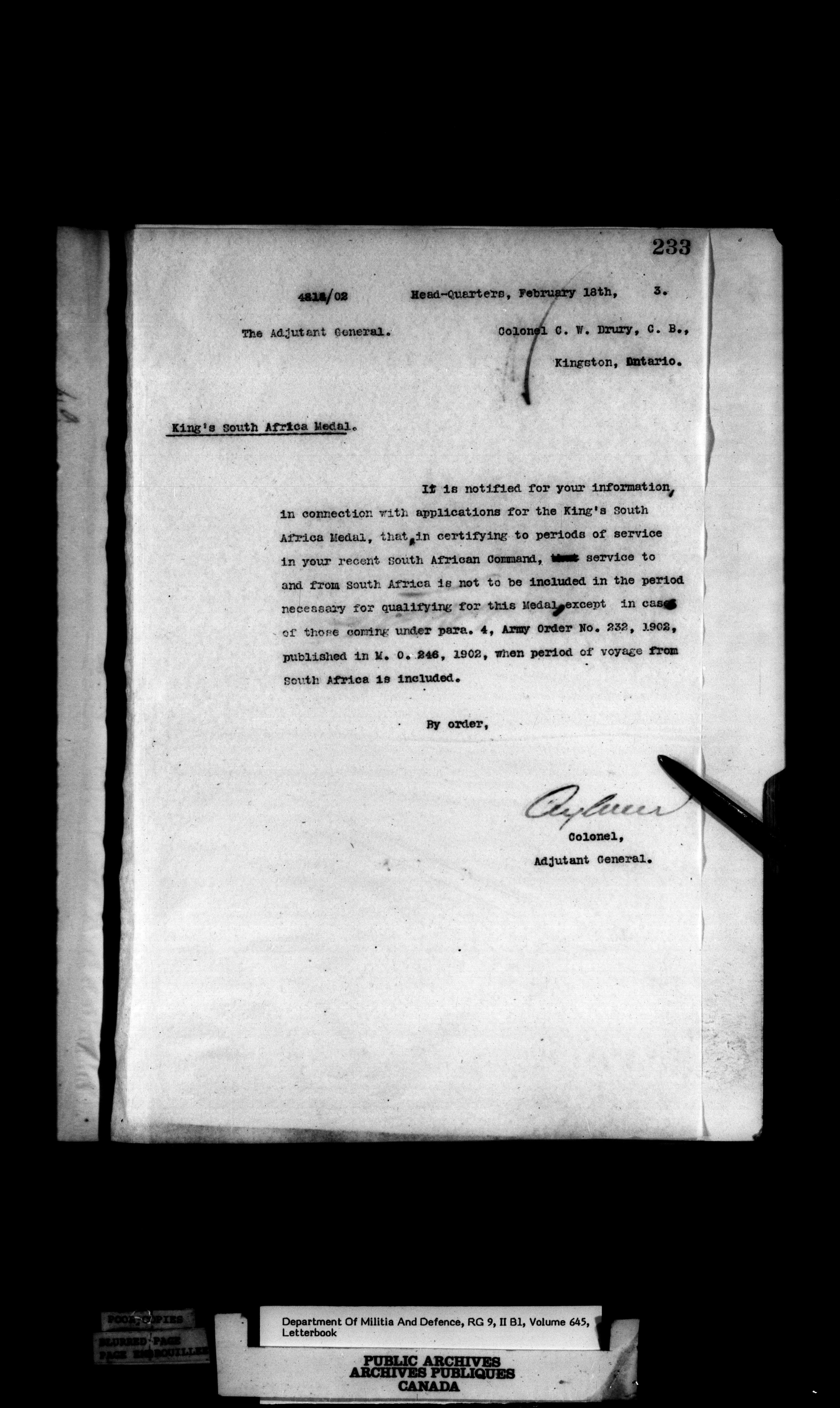 Correspondence of the General Officer Commanding (GOC) of the Canadian Militia and his predecessor, the Adjutant General - 374