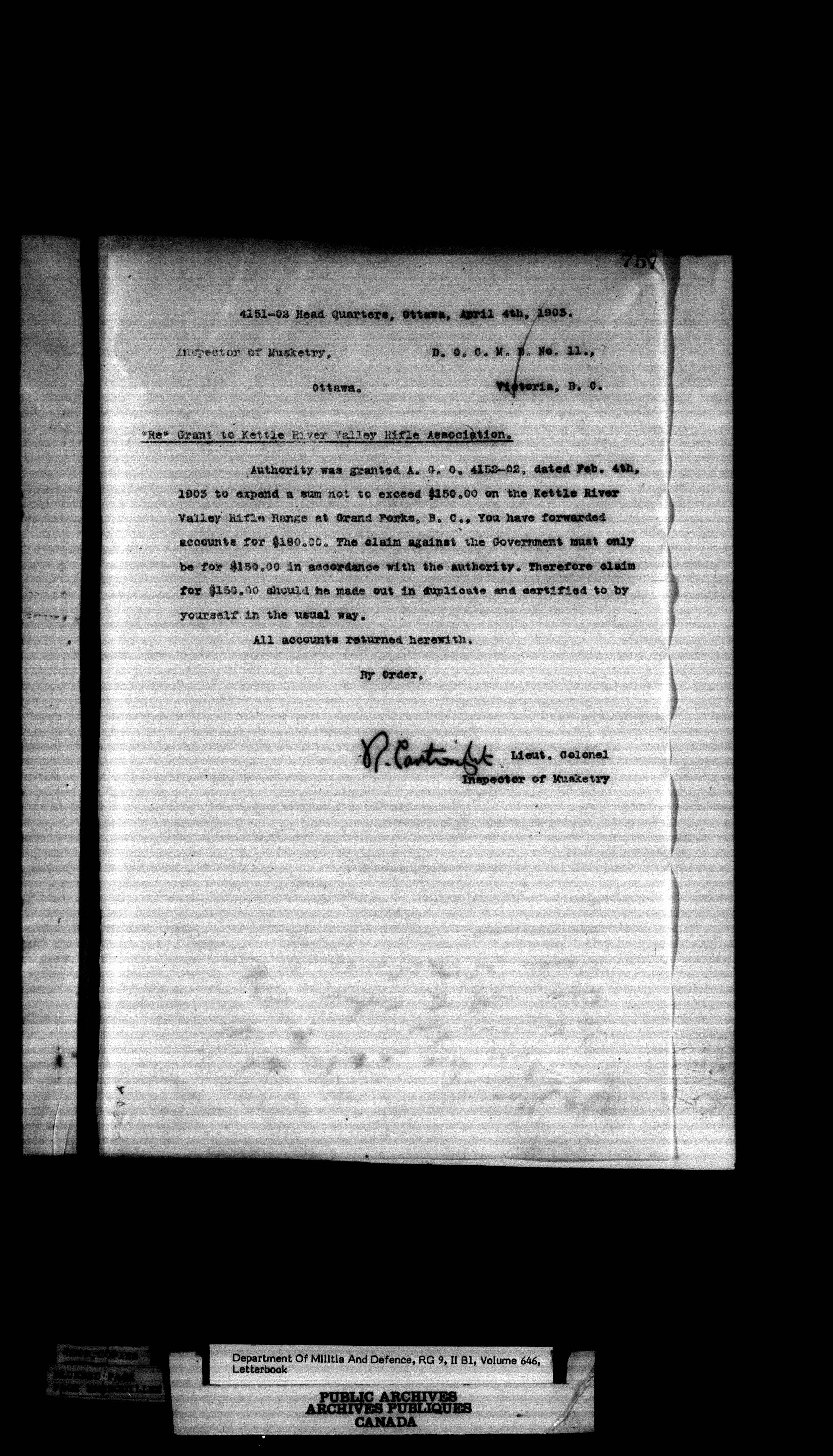 Correspondence of the General Officer Commanding (GOC) of the Canadian Militia and his predecessor, the Adjutant General - 375
